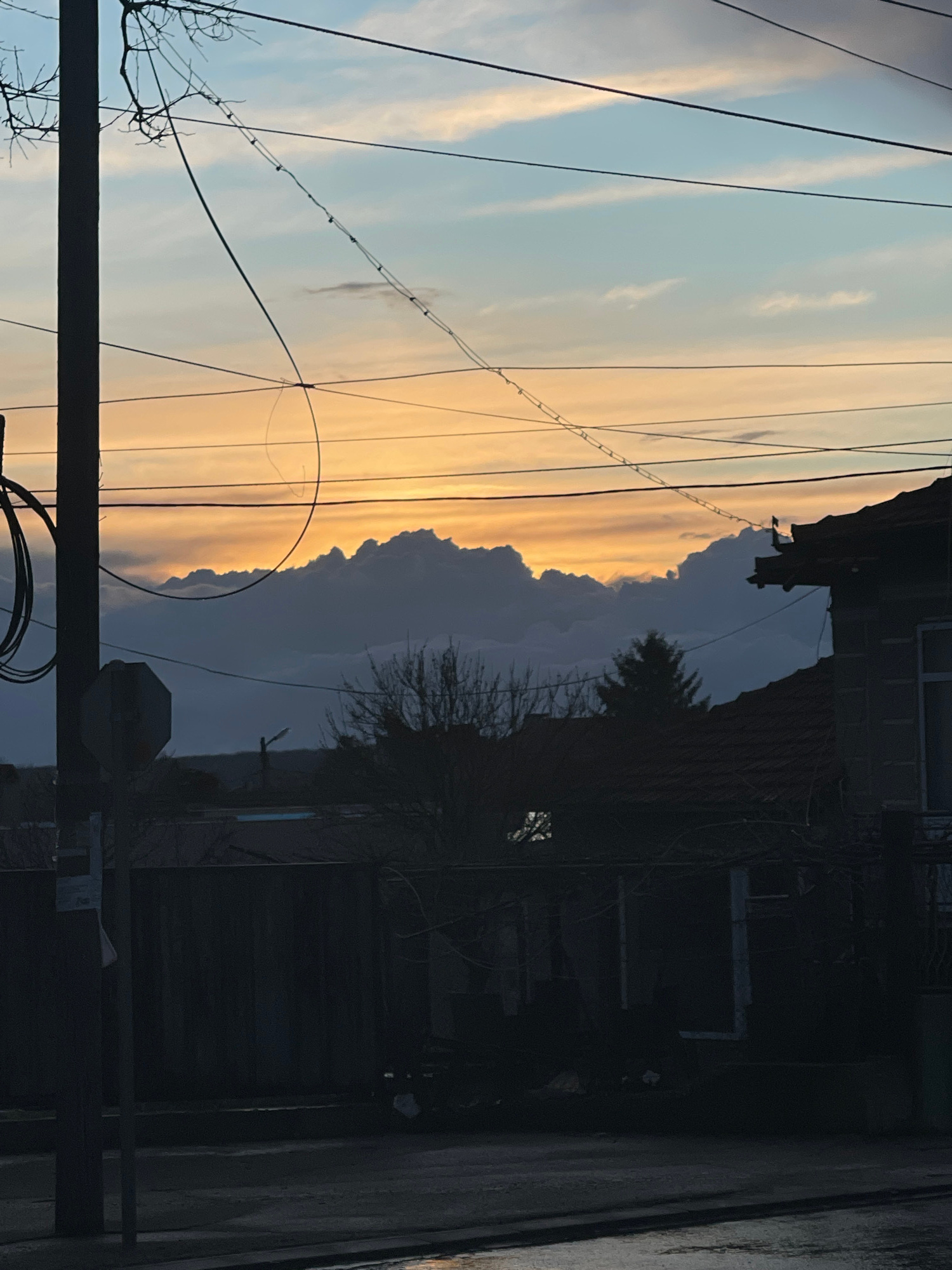 The image presents an evening urban scene, likely in Isperih, Bulgaria given the prompt. The foreground is dominated by utility poles and wires, obstructing the view. Beyond the utility infrastructure…read more