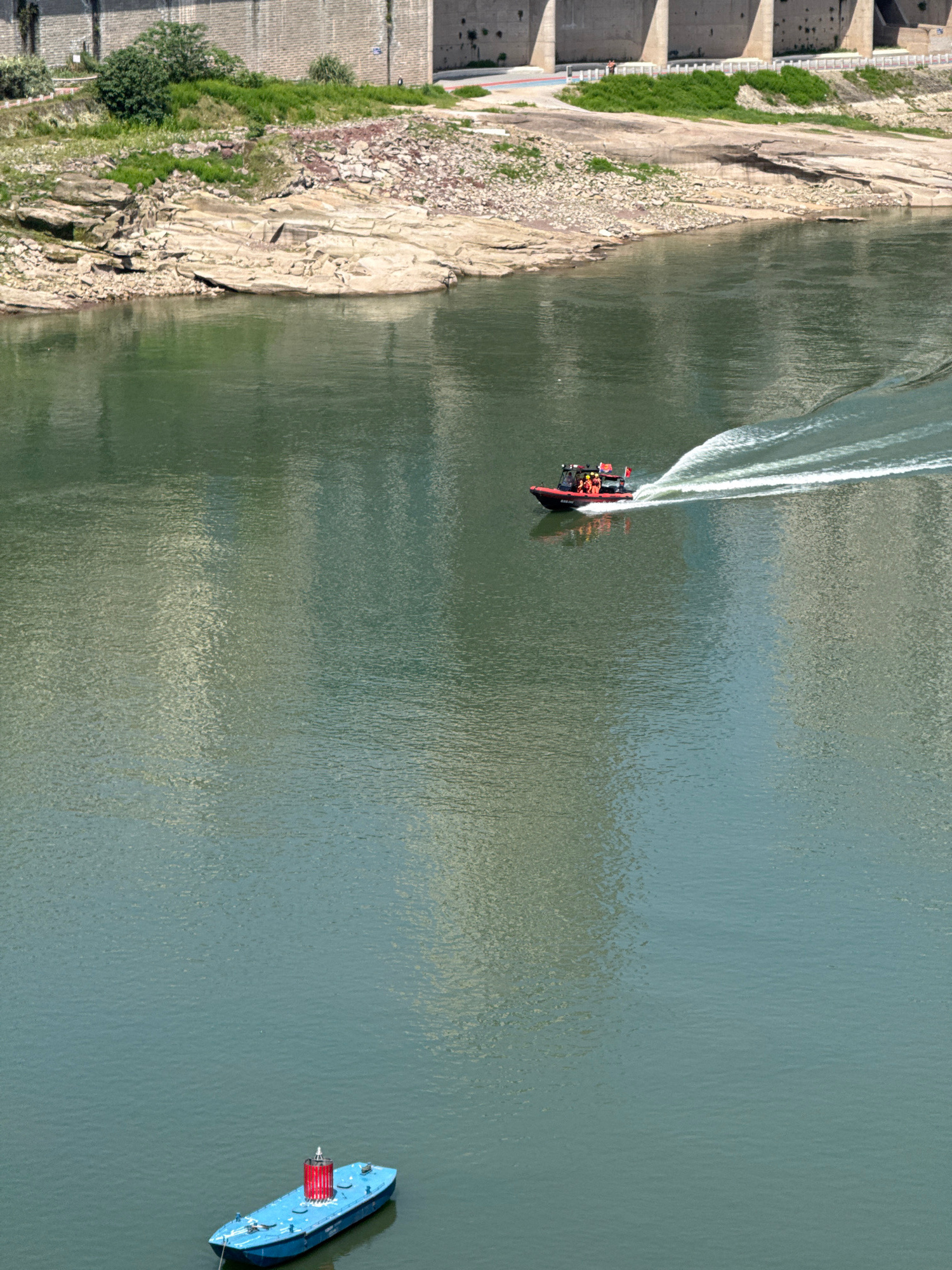 This high-angle, overhead photograph captures a wide expanse of greenish-blue water, likely a river or reservoir, bordered by a rocky shoreline and a massive concrete dam-like structure. The scene unf…read more