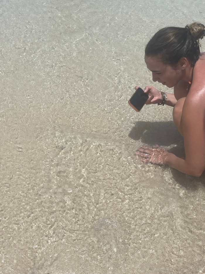 An adult female, with tanned skin and dark hair tied into a bun, is observed squatting in shallow, clear water over a light sandy bottom. This scene is consistent with a coastal area in the city of Za…read more