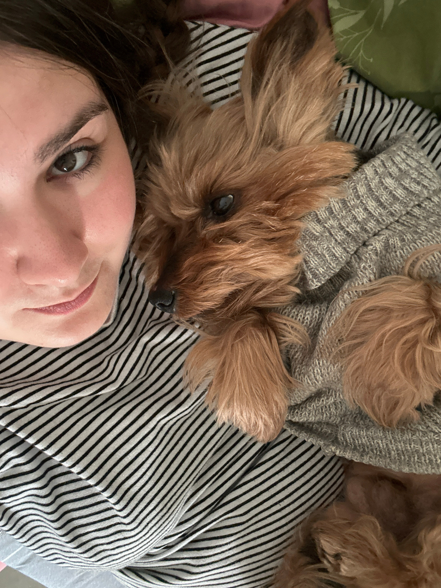 The image displays a close-up, high-angle shot of a female and a small dog positioned side-by-side, likely in an indoor setting within Ramat Gan, Israel. The female, visible from the mid-forehead to t…read more