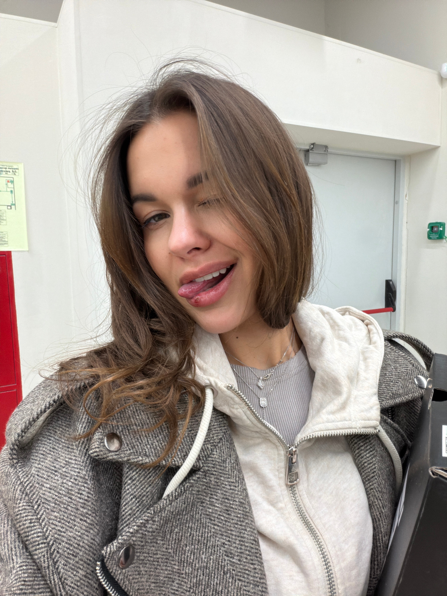 A young woman is captured in a playful indoor selfie, situated in Krasnoyarsk, Russia. She is shown from the chest up, with her head tilted, playfully winking with her right eye and sticking her tongu…read more