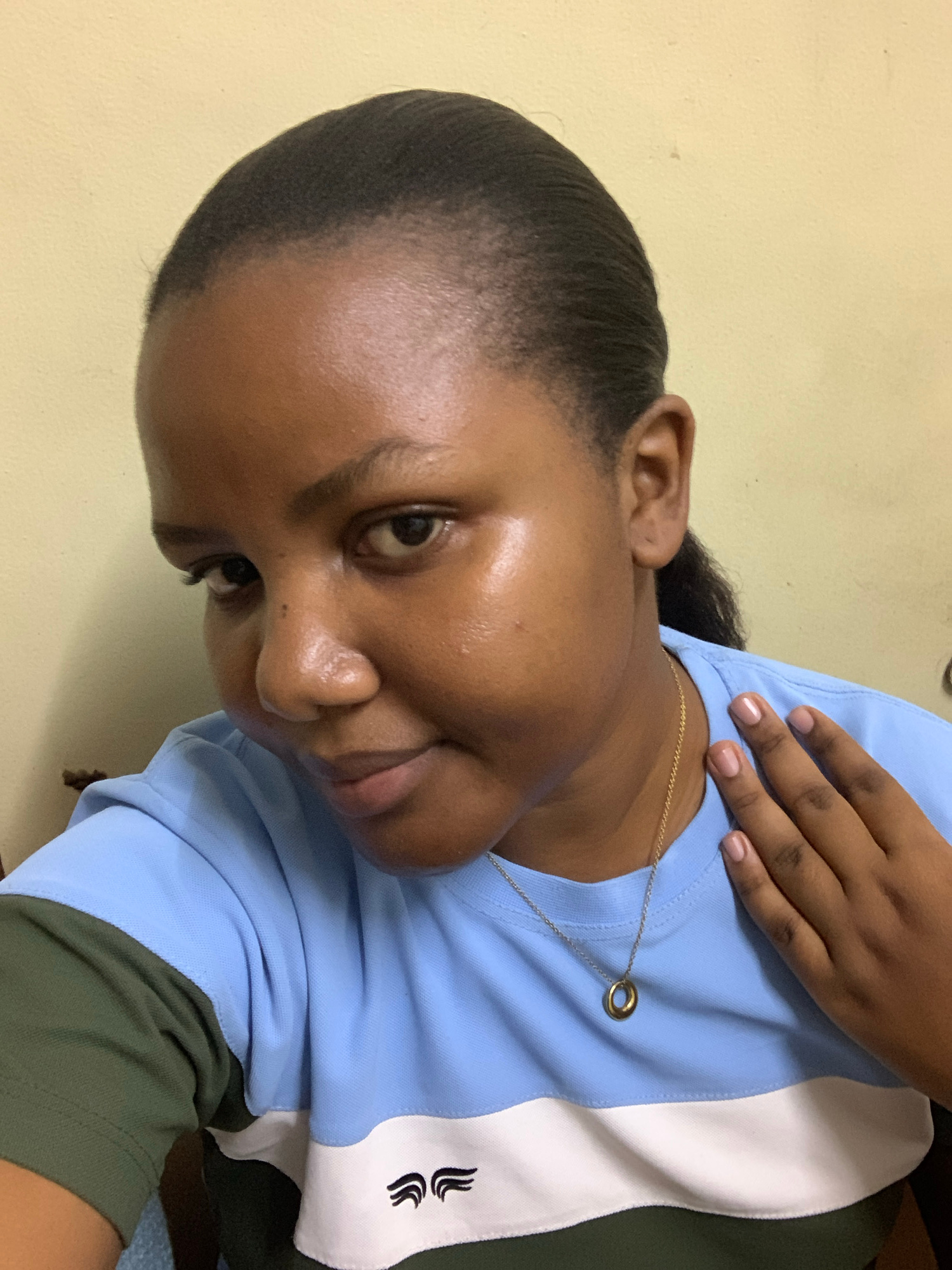 This close-up, vertical selfie features a person, likely female, with medium-dark skin and dark hair pulled back. The subject's head is tilted slightly, and they look towards the camera with a subtle,…read more