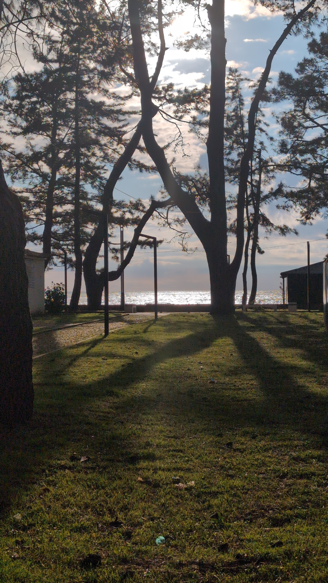 The scene is a sunlit coastal landscape, likely in Kobuleti, Georgia, given the local context. The foreground is dominated by a grassy area with shadows cast by a tree, and a few pieces of debris scat…read more