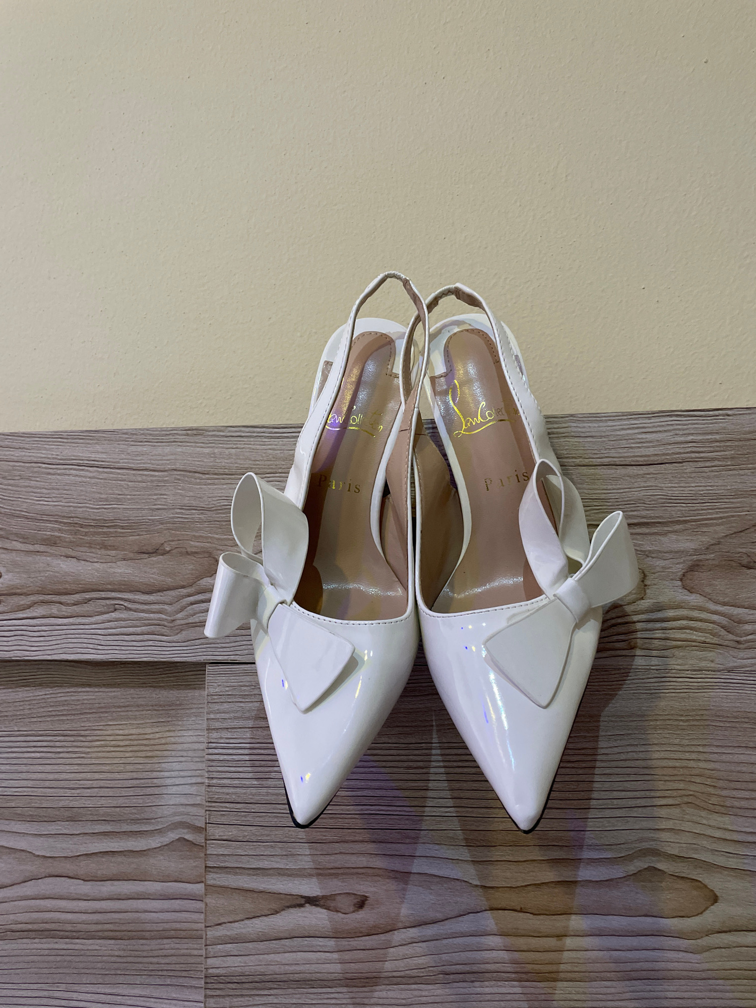 The image shows two white patent leather slingback heels with bows resting on a surface with a light-colored wood grain pattern. Part of a light yellow wall is visible in the background to the left of…read more