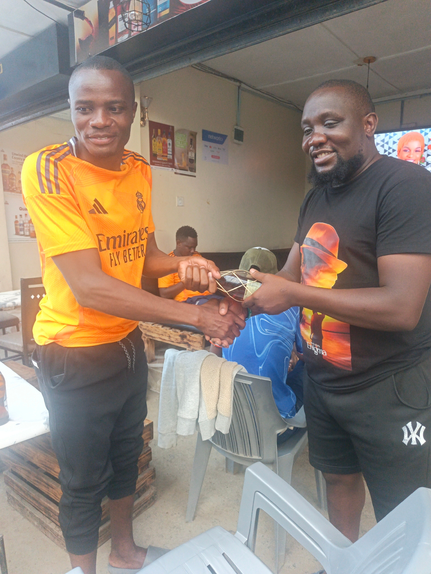 Two adult men are depicted in a handshake and the exchange of a bottle, potentially a transaction, taking place in an establishment that appears to be a small bar or restaurant. The man on the left we…read more