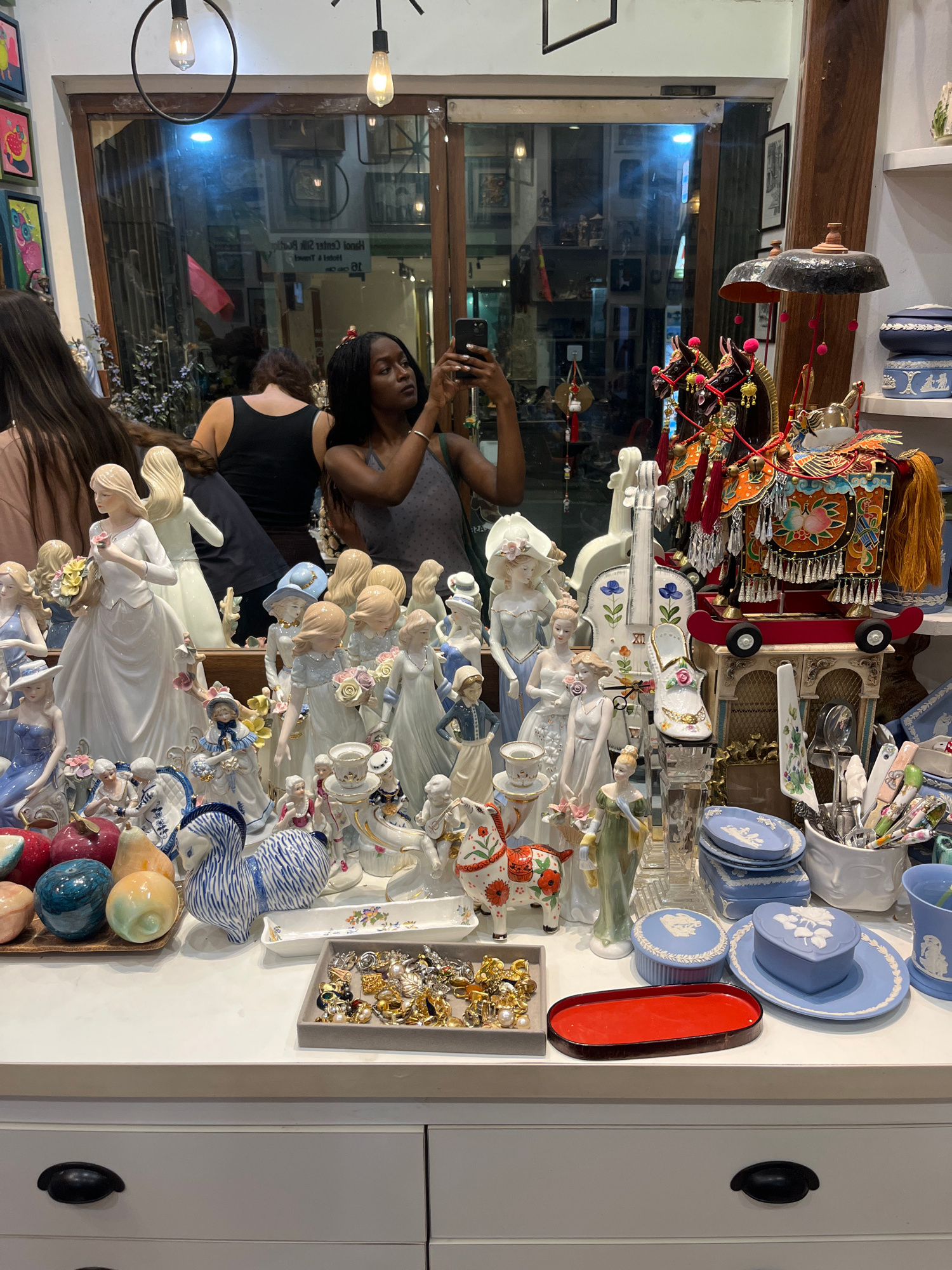 Captured in the city of Hà Nội, Vietnam, the scene unfolds in a cluttered retail environment, possibly a shop specializing in antiques or collectibles. Dominating the foreground is a tabletop or displ…read more
