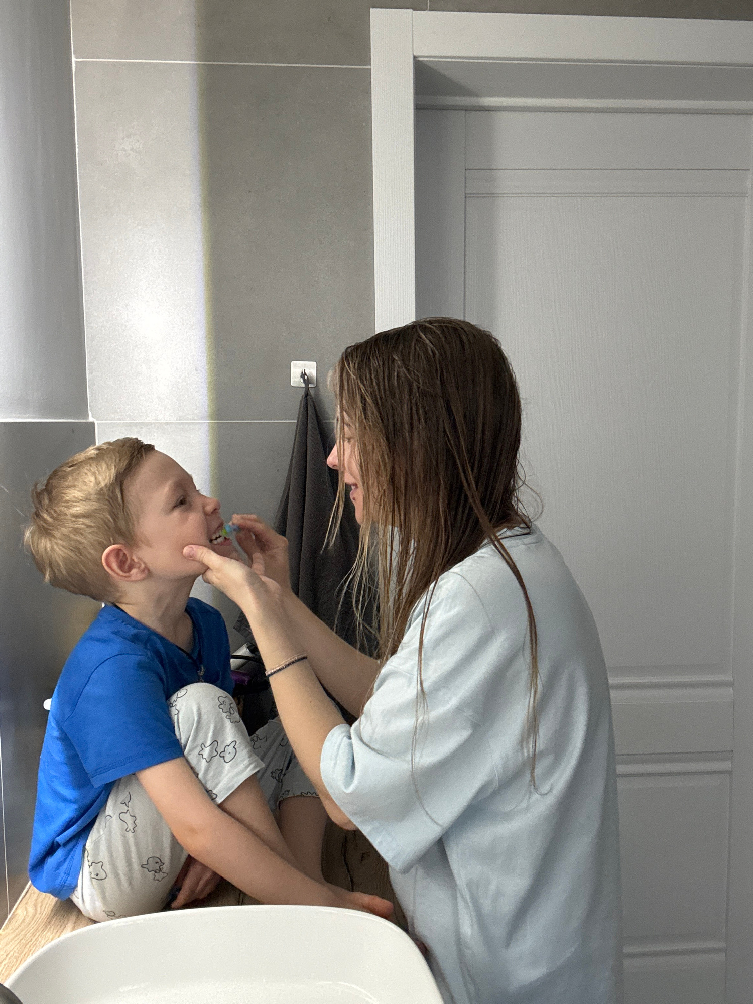 A young woman with shoulder-length wet brown hair is brushing the teeth of a young boy with blonde hair. Both are in a bathroom with white and grey tiled walls. The boy is wearing a blue shirt and paj…read more