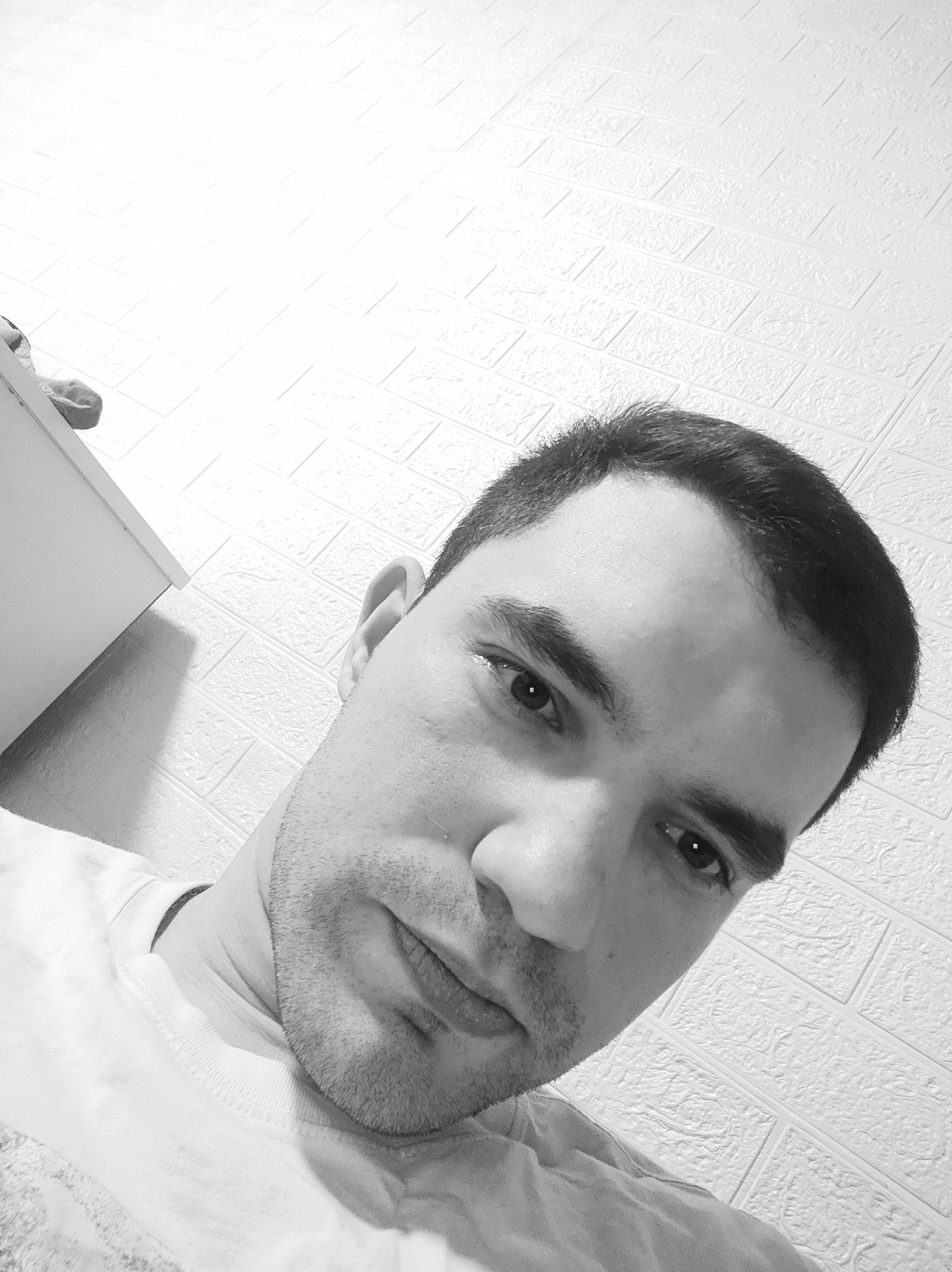 A black and white close-up selfie of a man. He has short, dark hair and stubble. The background appears to be a textured white wall, possibly made of panels. A white cabinet is partially visible in th…read more