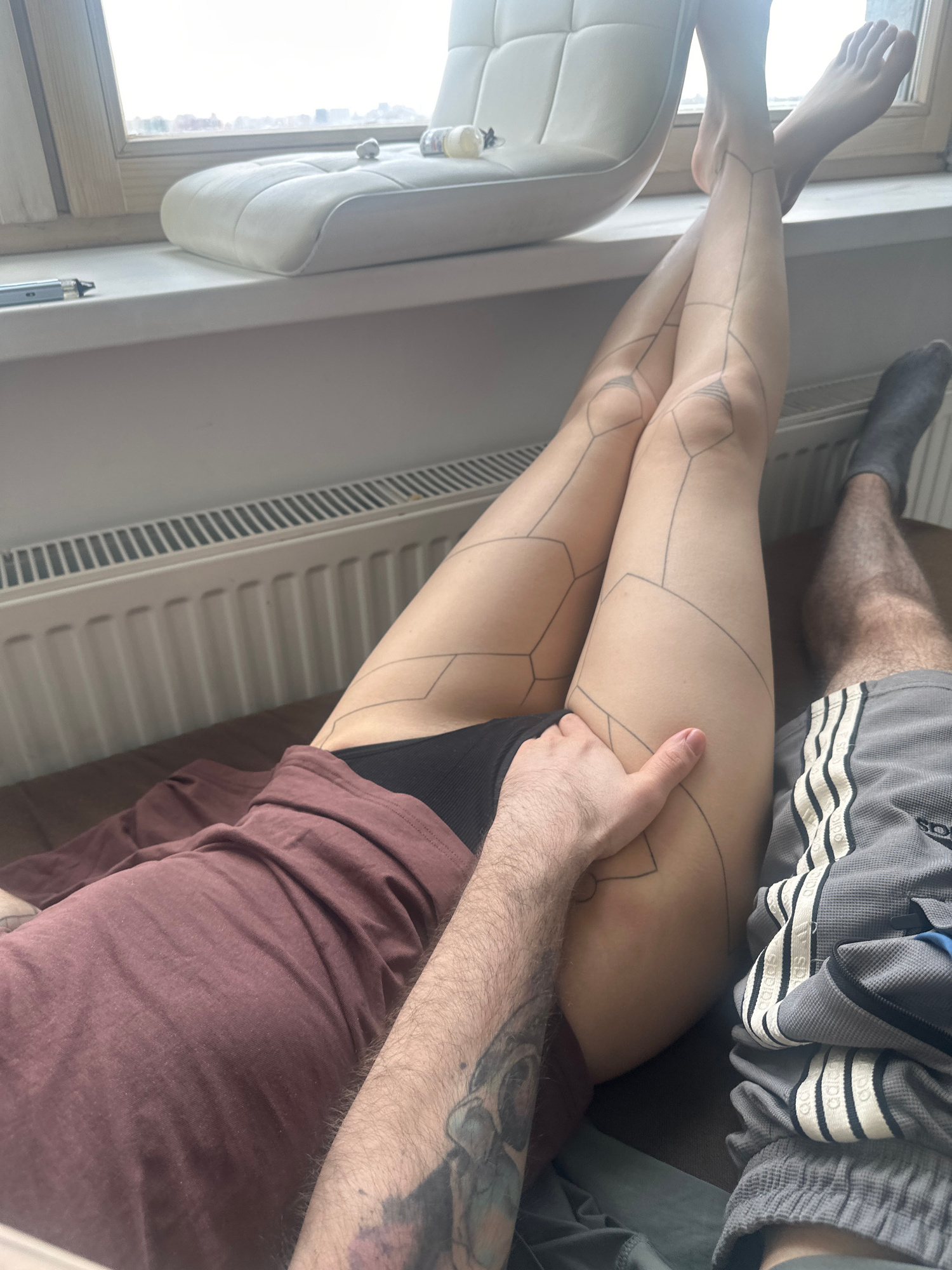A person's legs are crossed and elevated, with geometric patterns resembling tattoo outlines visible on the skin. The person is wearing dark underwear. A second person is seated to the side, wearing b…read more