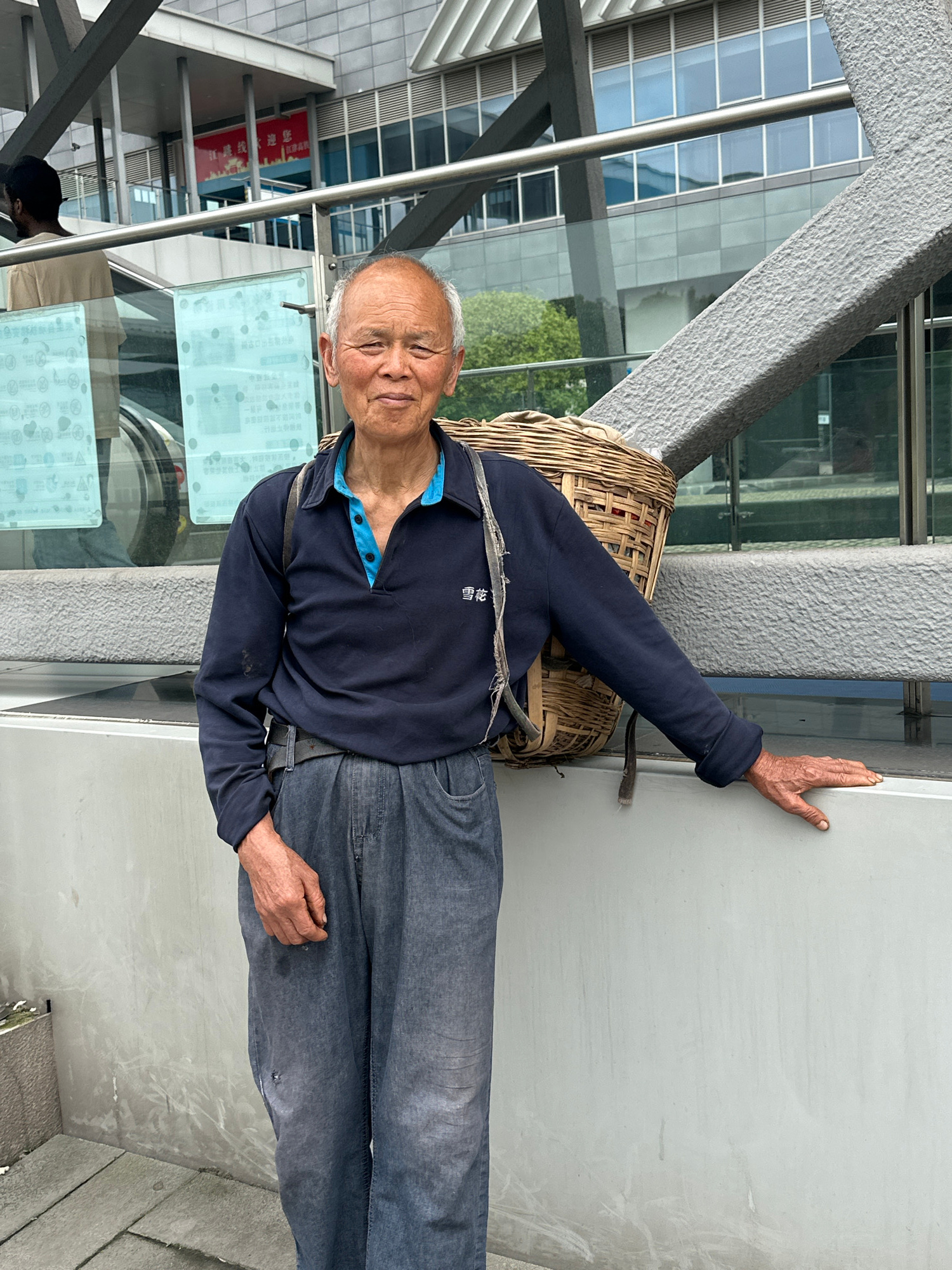 An elderly man with wrinkled skin and thin white hair is standing on a concrete surface, likely a sidewalk, with a woven basket strapped to his back. He is wearing a dark blue collared shirt with a liβ¦read more