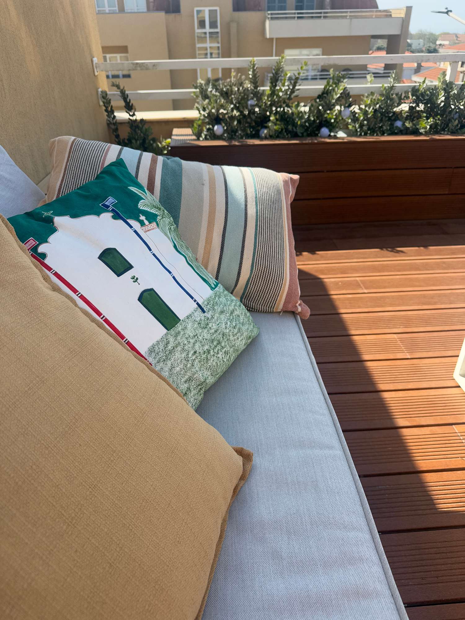 The image depicts a portion of a balcony, likely in Vila Nova de Gaia, Portugal, given the architectural style visible in the background. A wooden privacy screen forms the backdrop, partially illumina…read more