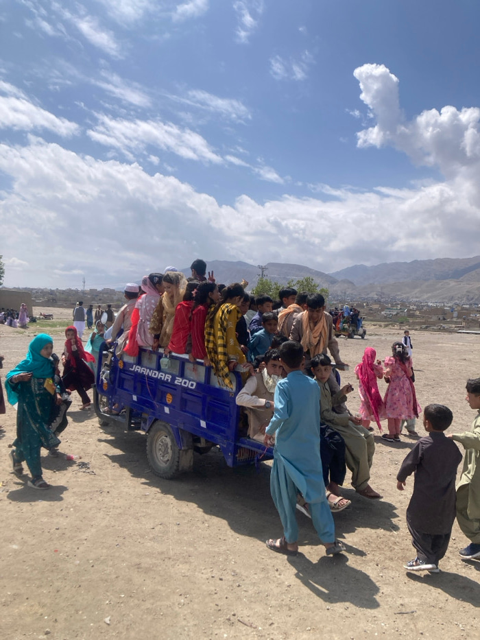 The image depicts an outdoor scene in Quetta City Tehsil, Pakistan, under a partly cloudy sky with prominent white cumulus clouds. A blue three-wheeled motorized vehicle, identifiable by "JAANDAR 200"…read more