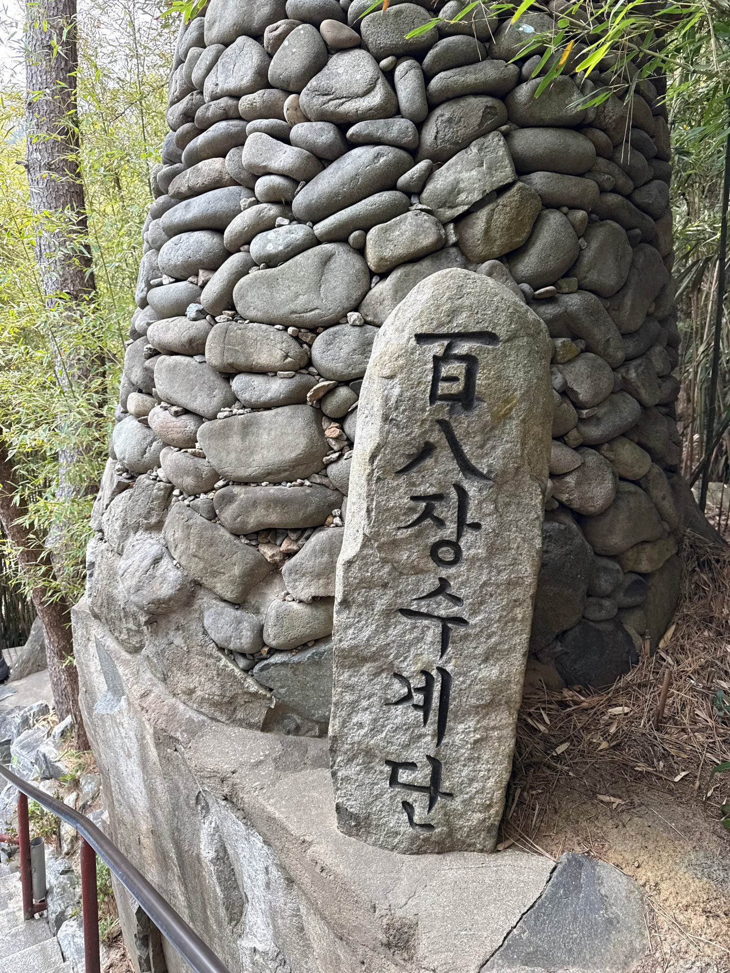 The image shows a stone sign, with text carved into it, set against a wall constructed from rounded stones. The wall appears to be part of a landscape feature, possibly a pathway or garden edging. Som…read more