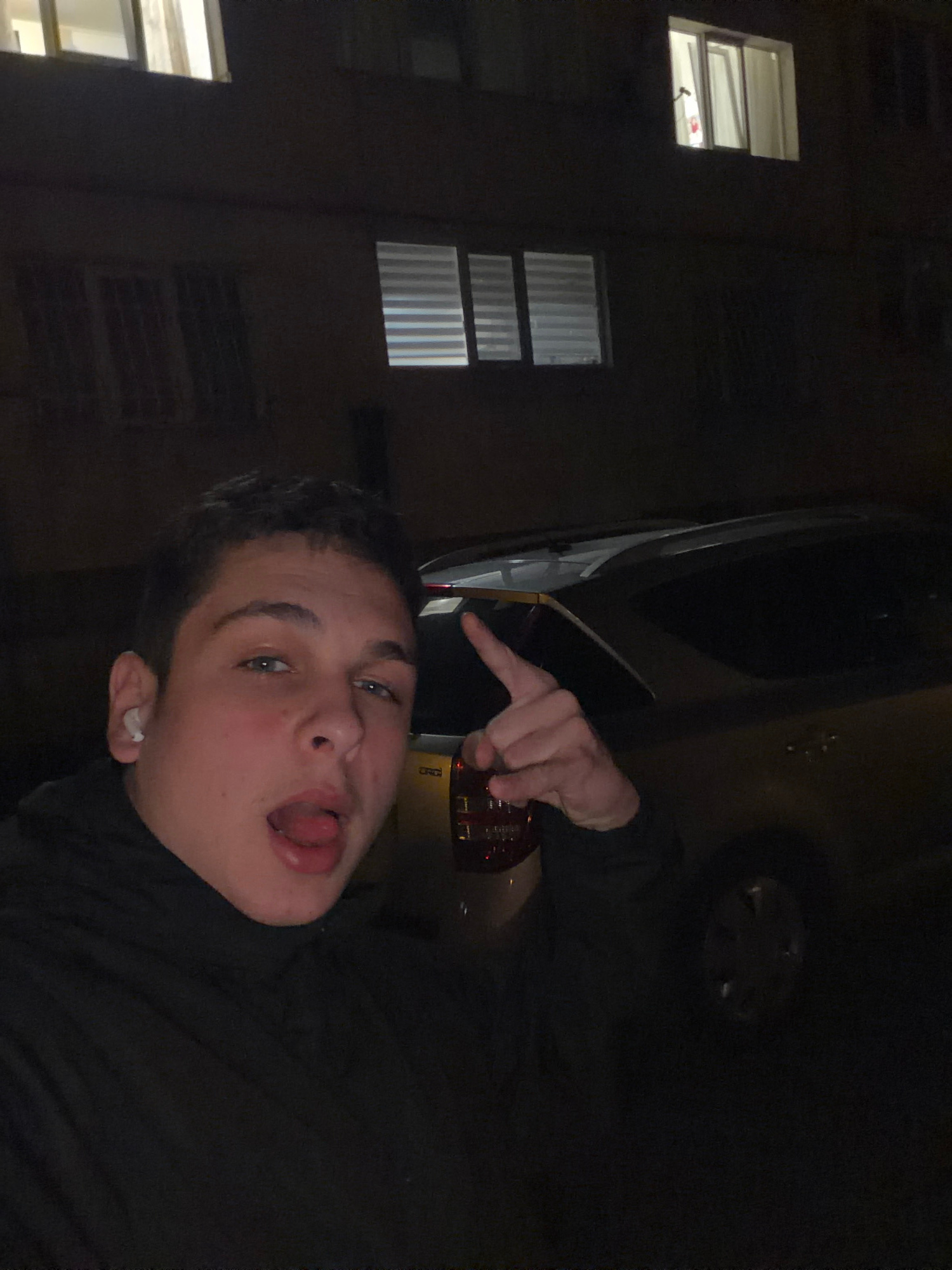 A poorly lit, rotated, close-up photograph shows a young male with blue eyes, dark hair, and fair skin sticking his tongue out towards the camera, with an earbud in his left ear. He is making a gesturβ¦read more
