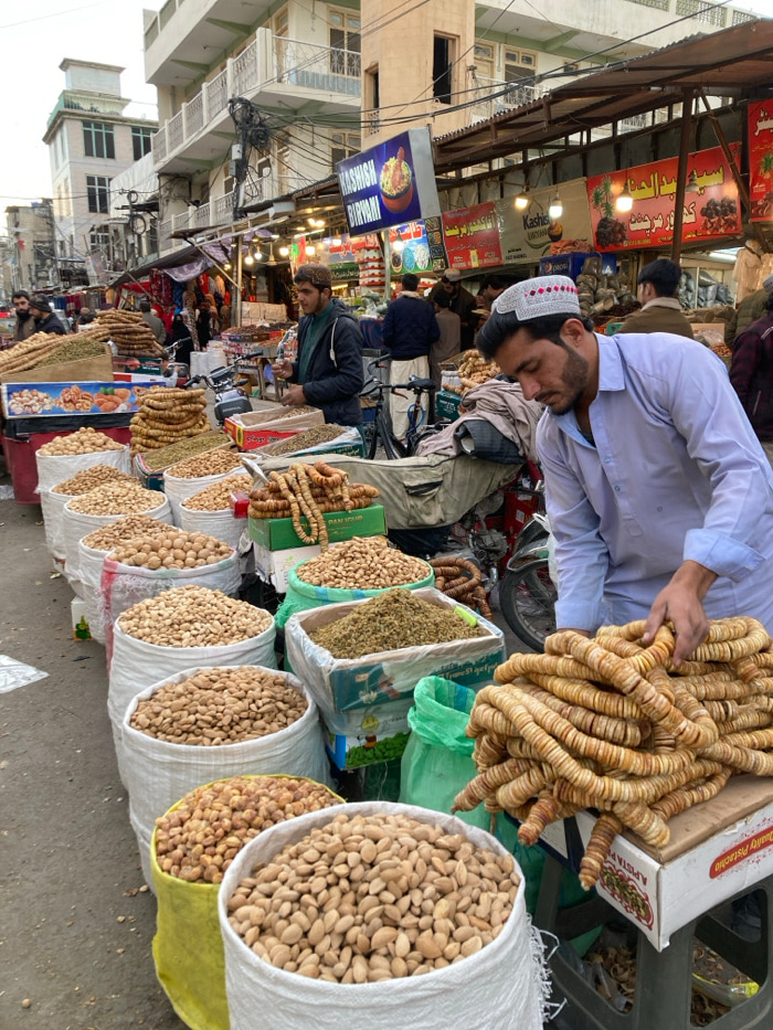 The image depicts an outdoor market scene on a paved surface in Quetta City Tehsil, Pakistan. In the foreground, a linear arrangement of approximately ten large sacks, primarily white but including ye…read more