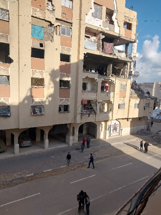 An elevated daytime image depicts a heavily damaged multi-story building in Khan Yunis, Palestinian Territory, alongside a paved street. The multi-floor, light-beige structure exhibits extensive damag…read more
