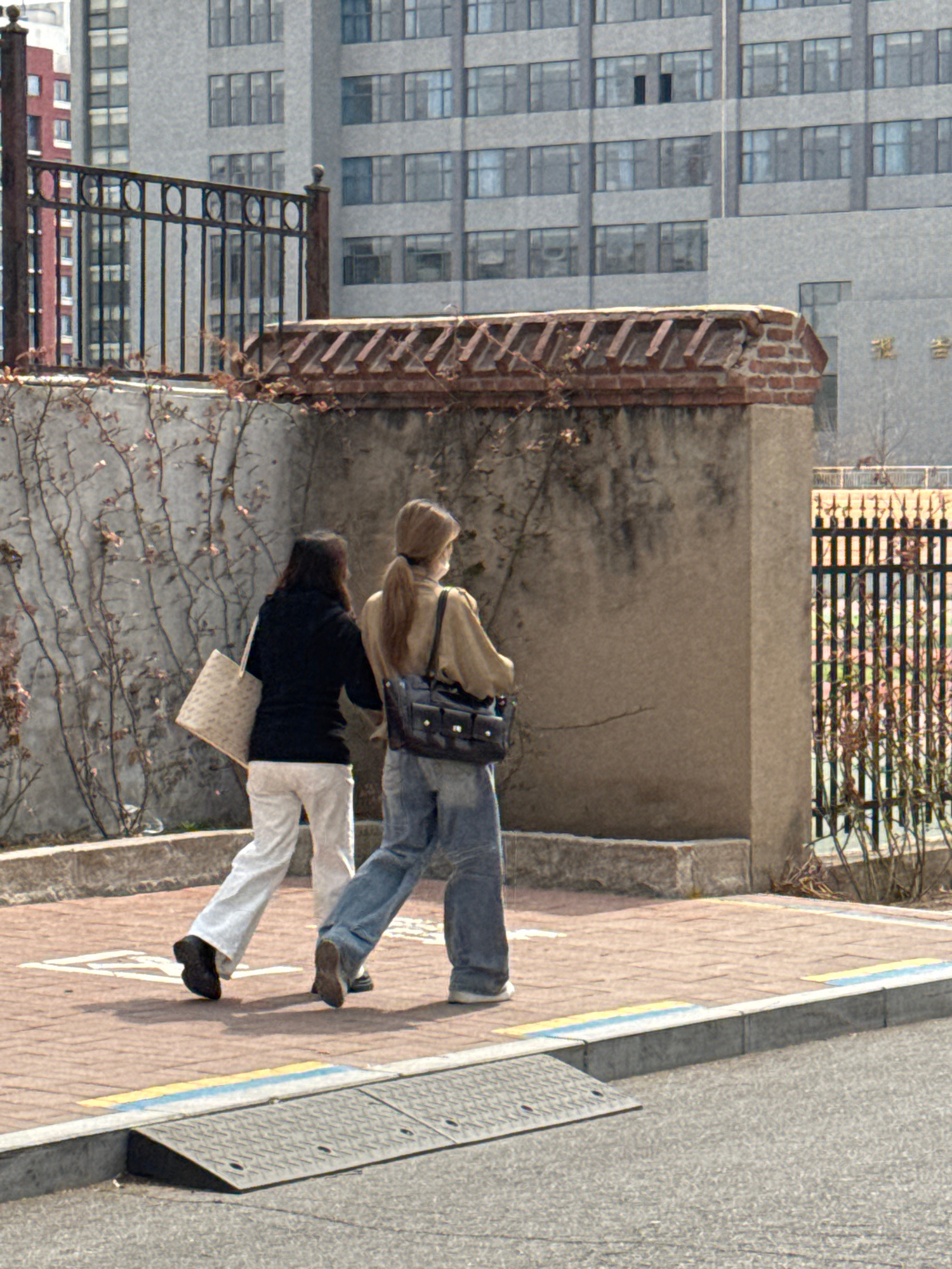 Two individuals are walking on a brick sidewalk adjacent to a street. One person, with blonde hair, is wearing a tan jacket, blue jeans, and carrying a dark-colored bag. The other person is wearing a…read more