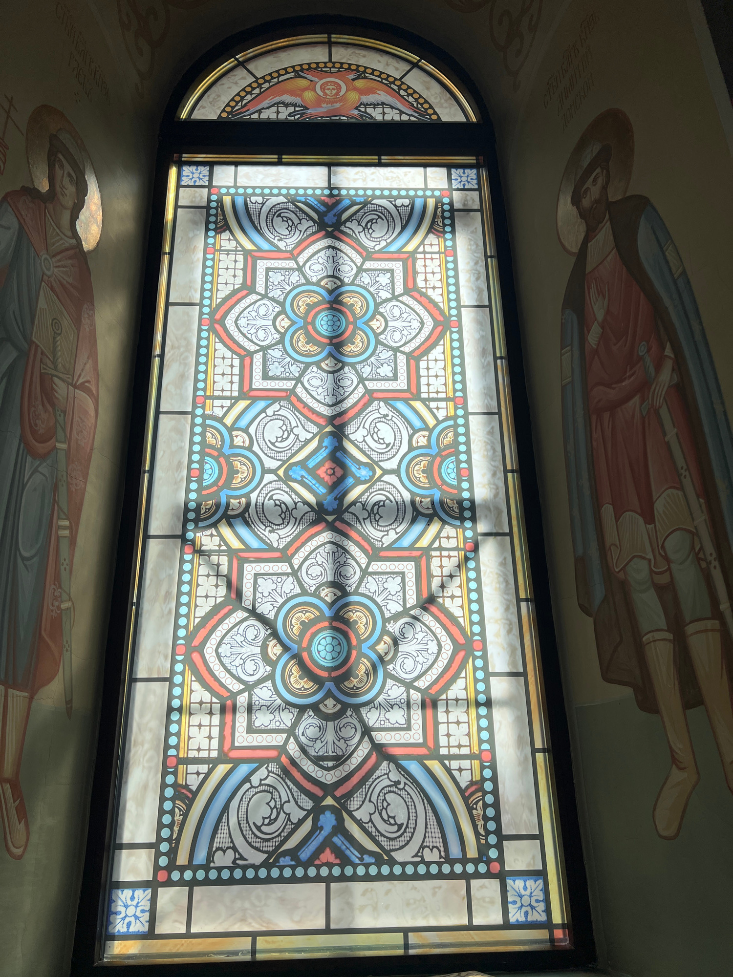 The image captures a stained-glass window within a church, likely in Kargapolye, Russia, given the style of iconography and architecture. The window is rectangular with a rounded section on the left.…read more