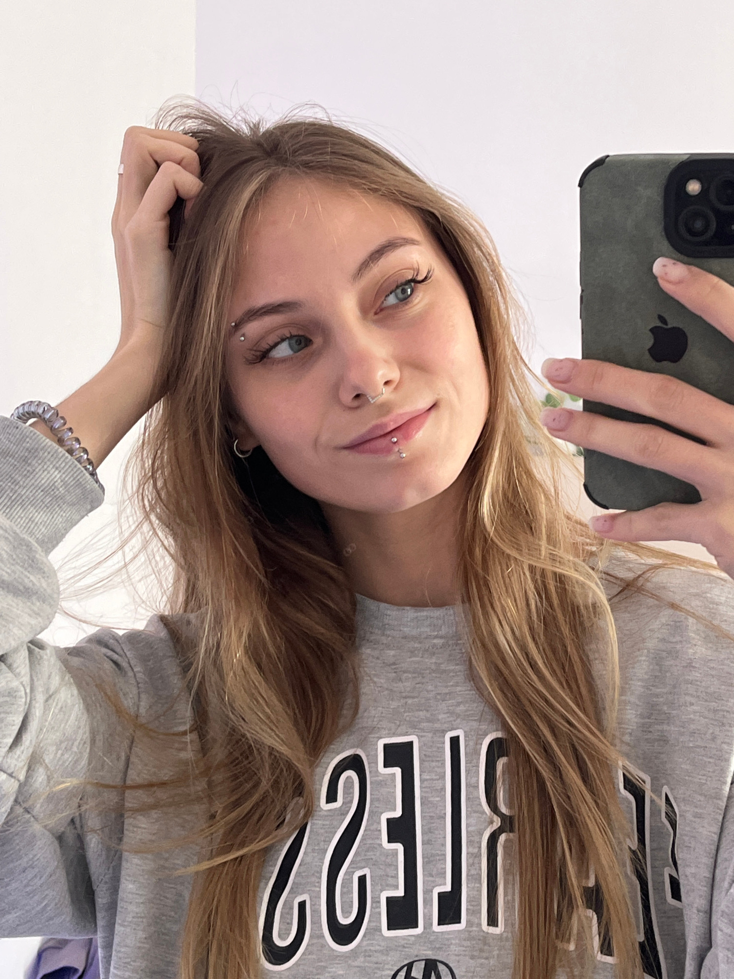 A young woman with long, light brown hair is holding a phone in her left hand to take a selfie. She is wearing a gray sweatshirt with large black letters and a small black design visible on the right…read more