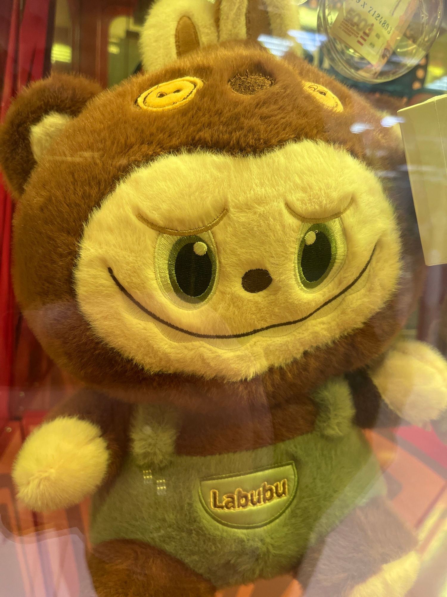 A close-up shows a plush monkey toy with a light brown face, darker brown body, and green overalls with "Labubu" embroidered on the chest, lying inside a display case. Visible in the background is a g…read more