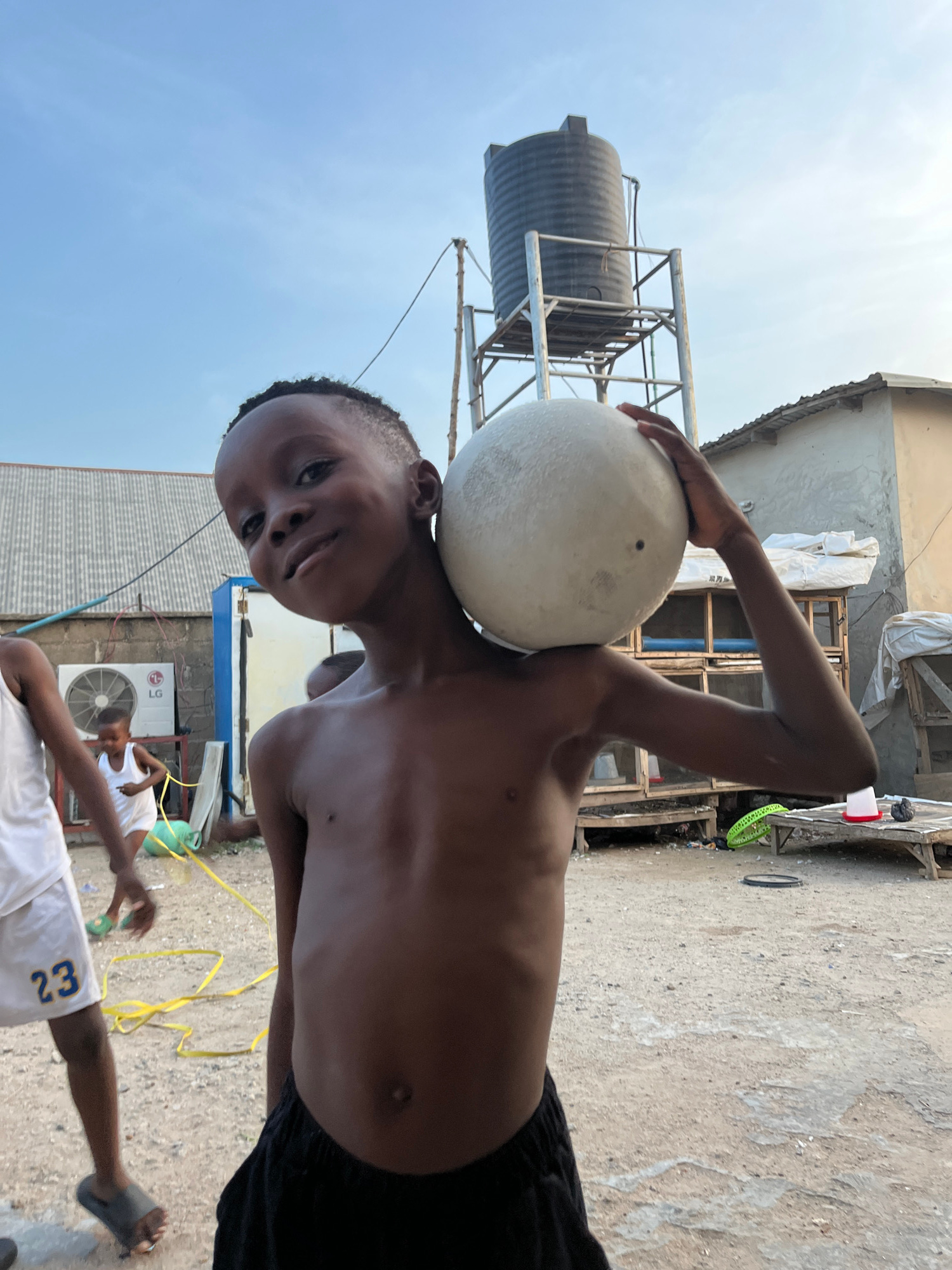The image shows a shirtless child balancing a white ball on their head in Madalla, Nigeria. The child is dark-skinned and wearing dark shorts. The background shows a water tank on a metal frame, varioβ¦read more