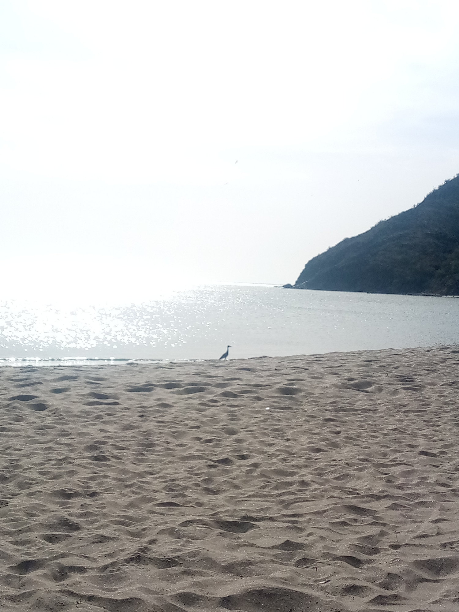 The image depicts a beach scene in Juan Griego, Venezuela. In the foreground, there is sand. In the middle ground, the sea reflects sunlight, and a single bird stands on the shoreline. In the backgrouβ¦read more