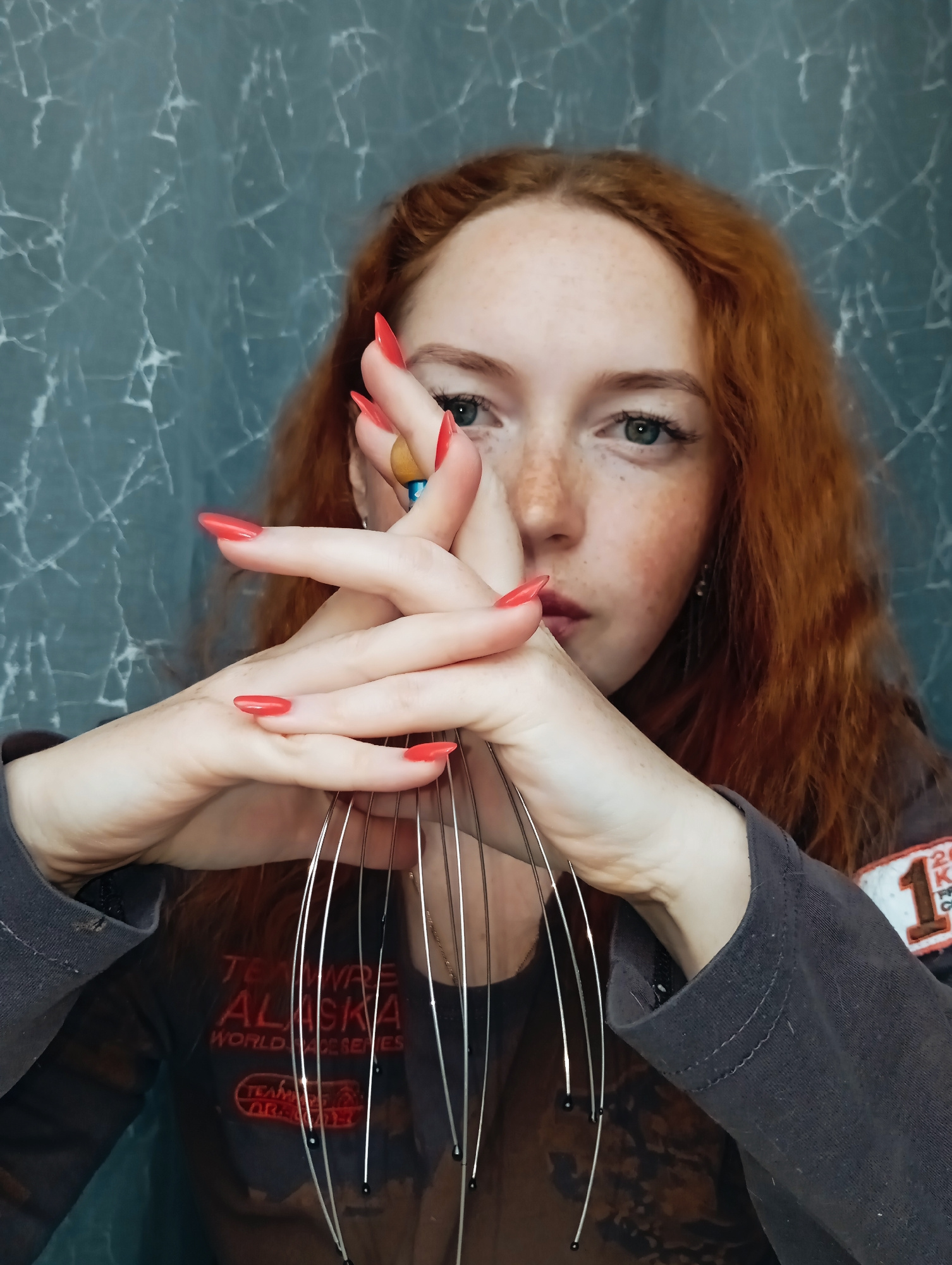 A woman with red hair and freckles is shown in a close-up shot. She is wearing a dark gray long-sleeved shirt with a patch visible on the upper right sleeve. Her fingernails are painted red. She is ho…read more