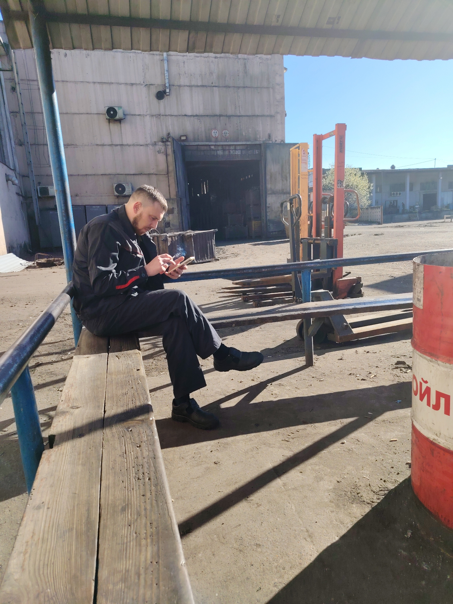 A man in a black jumpsuit sits on a wooden bench under a metal canopy structure. He is holding a mobile phone in his hands and appears to be looking at it. He is smoking. He has short hair and a beard…read more