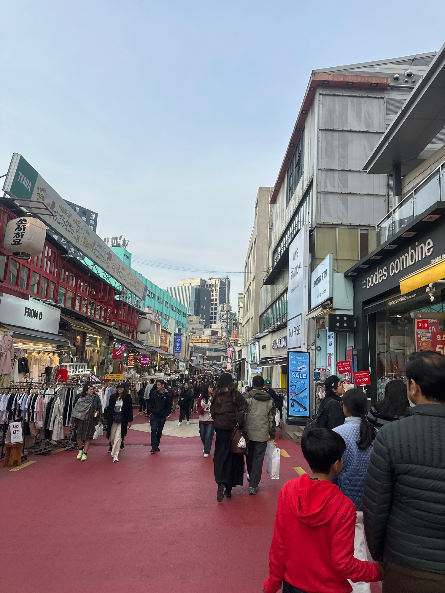 This image depicts a bustling pedestrian shopping street in the Hongdae district of Seoul, South Korea. The street surface is a distinctive bright red pavement, with faint yellow lines occasionally vi…read more