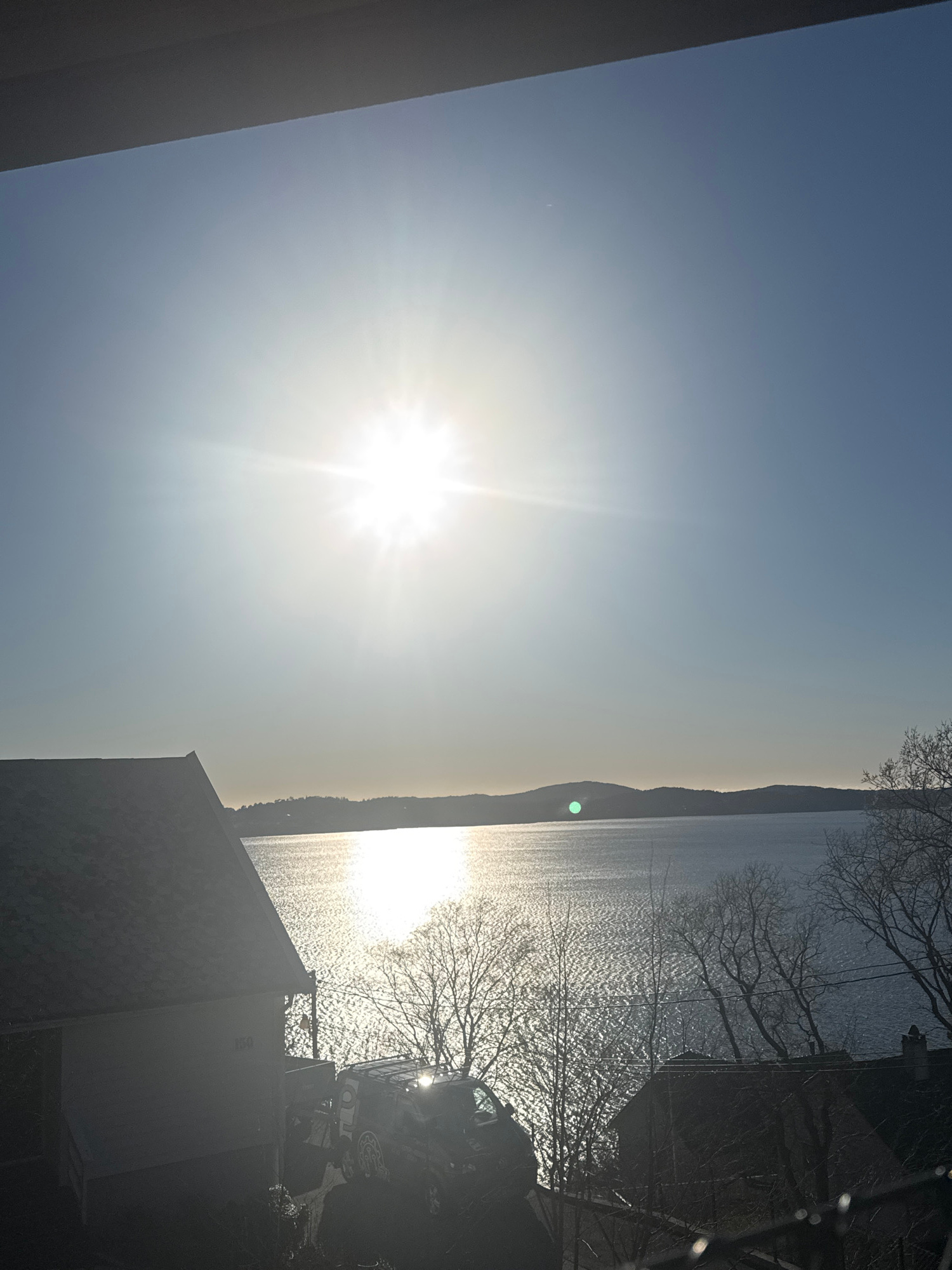 The image presents a landscape under bright sunlight, likely near Bergen, Norway. The sky is clear blue, with the sun positioned prominently. Below, a body of water reflects the sunlight, creating a s…read more