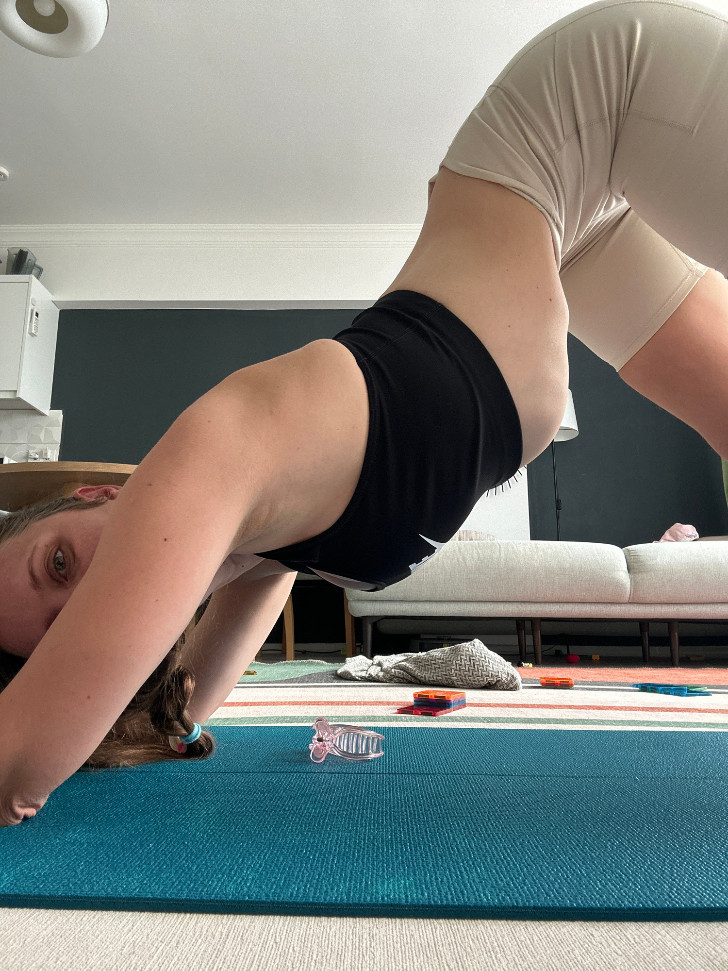 This media file presents an indoor scene in Fethiye, Turkey, capturing a person in an inverted backbend pose, likely performing yoga or an exercise. The image is oriented sideways, showing the individ…read more