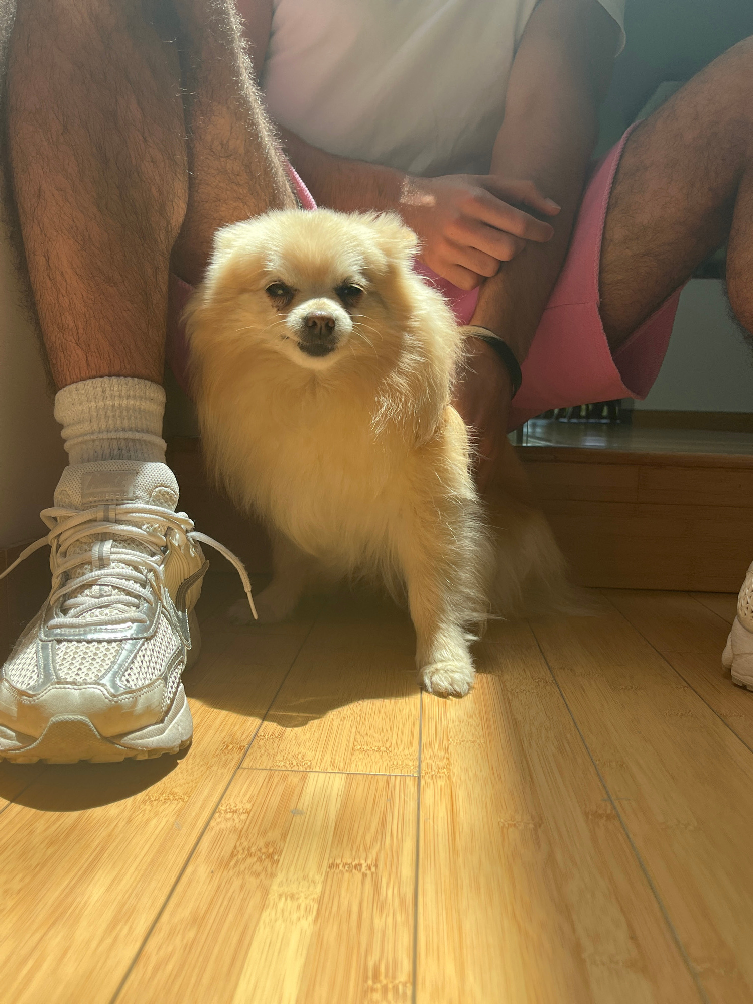 A cream-colored, fluffy dog, possibly a Pomeranian, is centered in the frame, looking directly at the camera with a gentle expression. The dog is positioned on a light wooden plank floor, bathed in br…read more