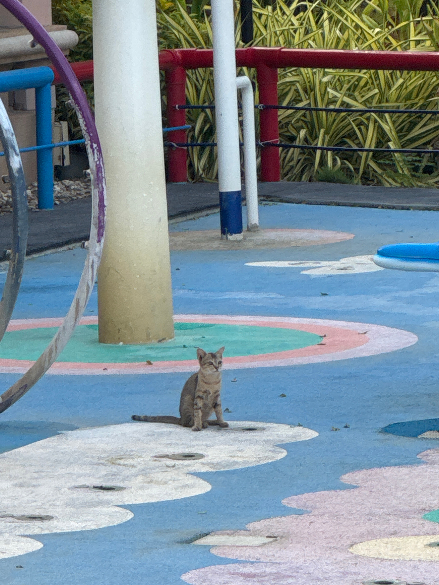 A cat perches on a painted mural, likely a playground wall, in Patong, Thailand. The mural depicts a colorful design of clouds and rainbows. Adjacent to the mural is a playground structure constructed…read more