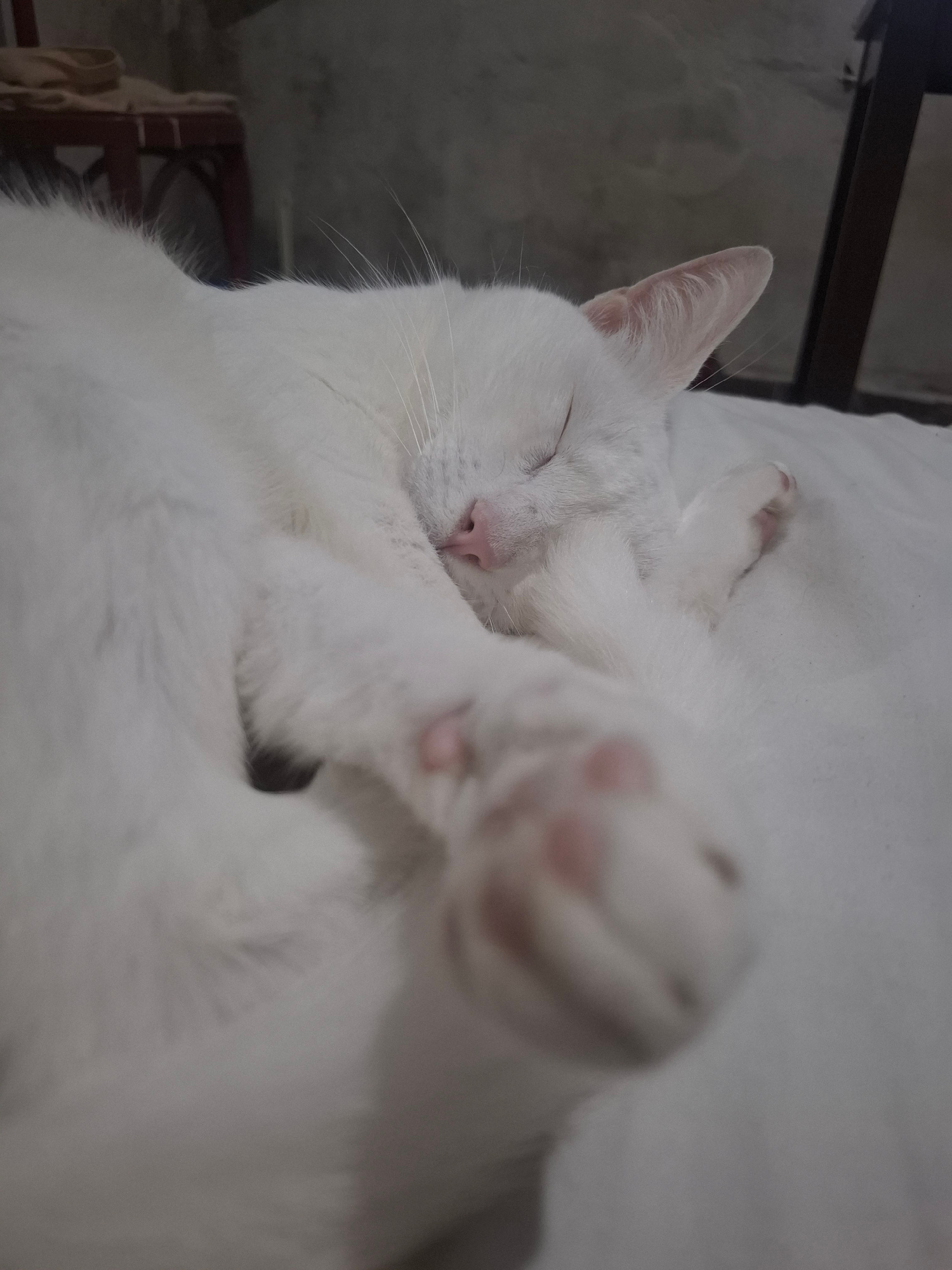 A white cat is sleeping on a white surface, possibly a bed or blanket. The cat's eyes are closed, and its pink nose is visible. One of the cat's paws is raised near its face. The background is blurredβ¦read more