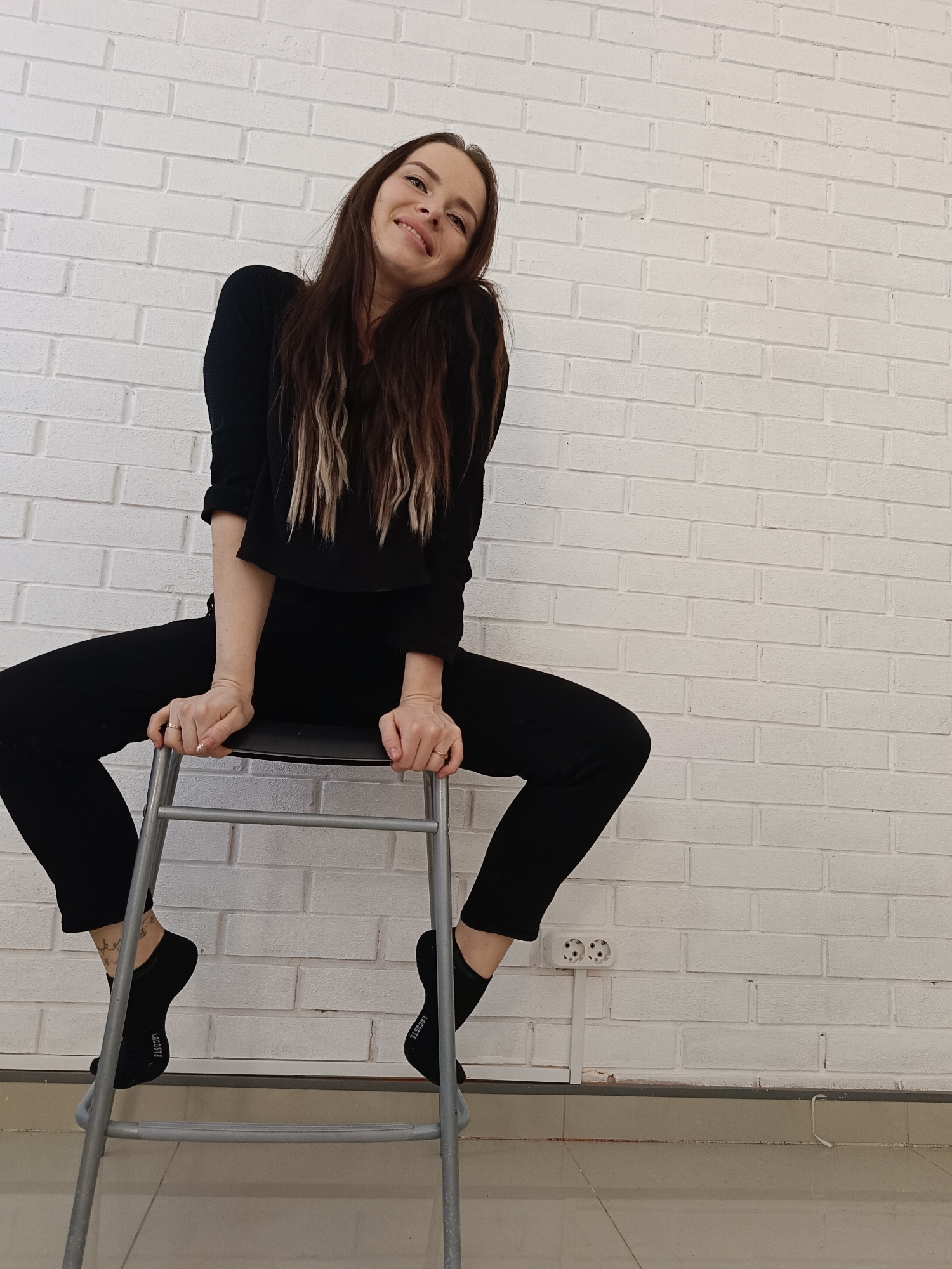A young woman with long, dark hair and lighter streaks sits on a grey metal stool in front of a white brick wall. She is wearing a black long-sleeved top and black pants, and black socks with the word…read more