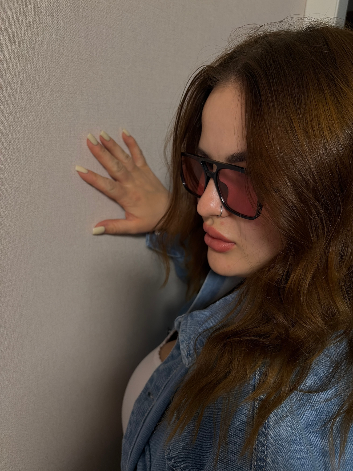 A woman with auburn hair, wearing a denim jacket and pink tinted glasses, rests her hand on a textured surface. She has a nose ring. Part of a white garment, possibly a bra or tank top, is visible ben…read more
