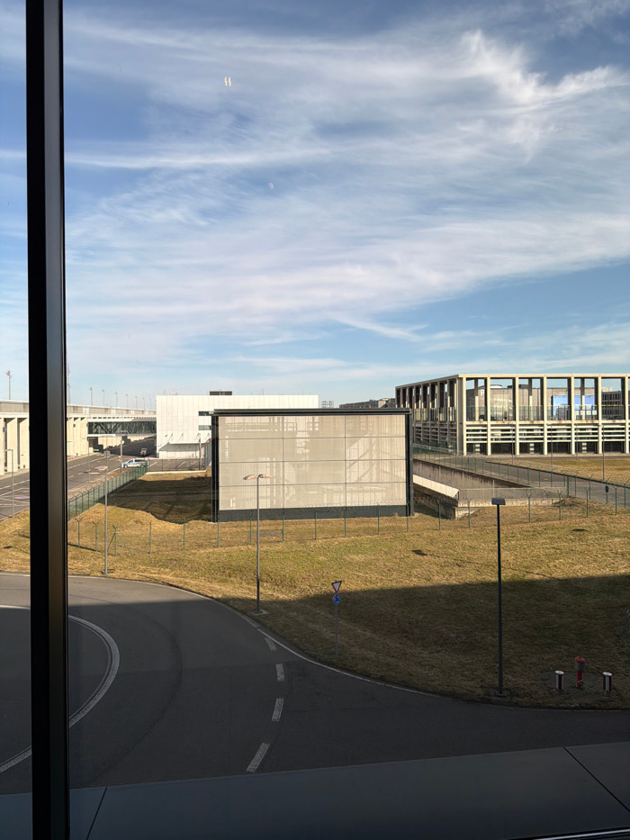 This image depicts an exterior scene observed through a large window, likely within the Berlin Brandenburg Airport (BER) complex in Schönefeld, Germany. The sky is predominantly blue with scattered, w…read more