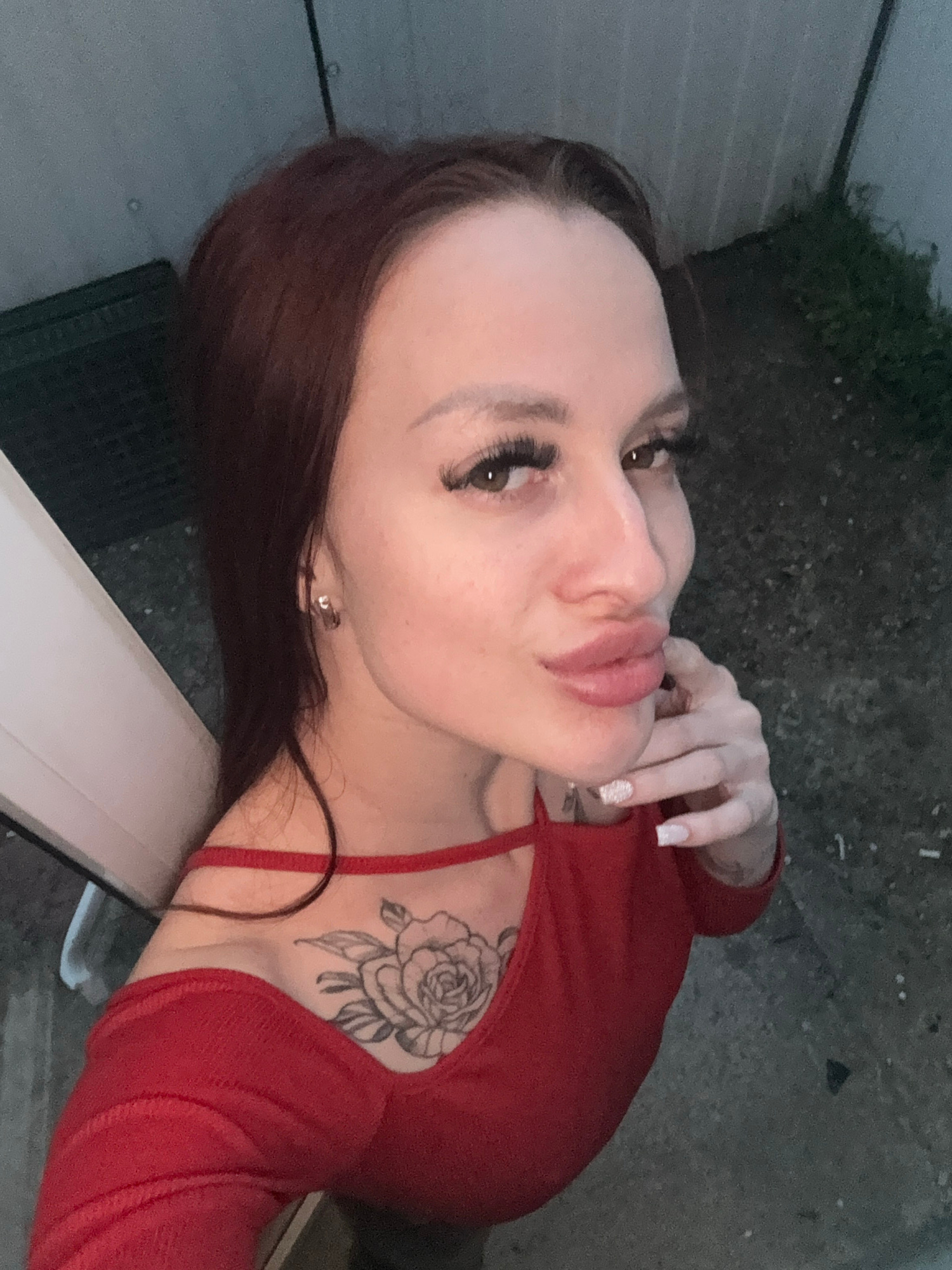 A medium close-up shot depicts a woman with auburn hair wearing a red top with spaghetti straps. She has a rose tattoo on her upper chest. Her nails are manicured, and she is wearing false eyelashes.…read more
