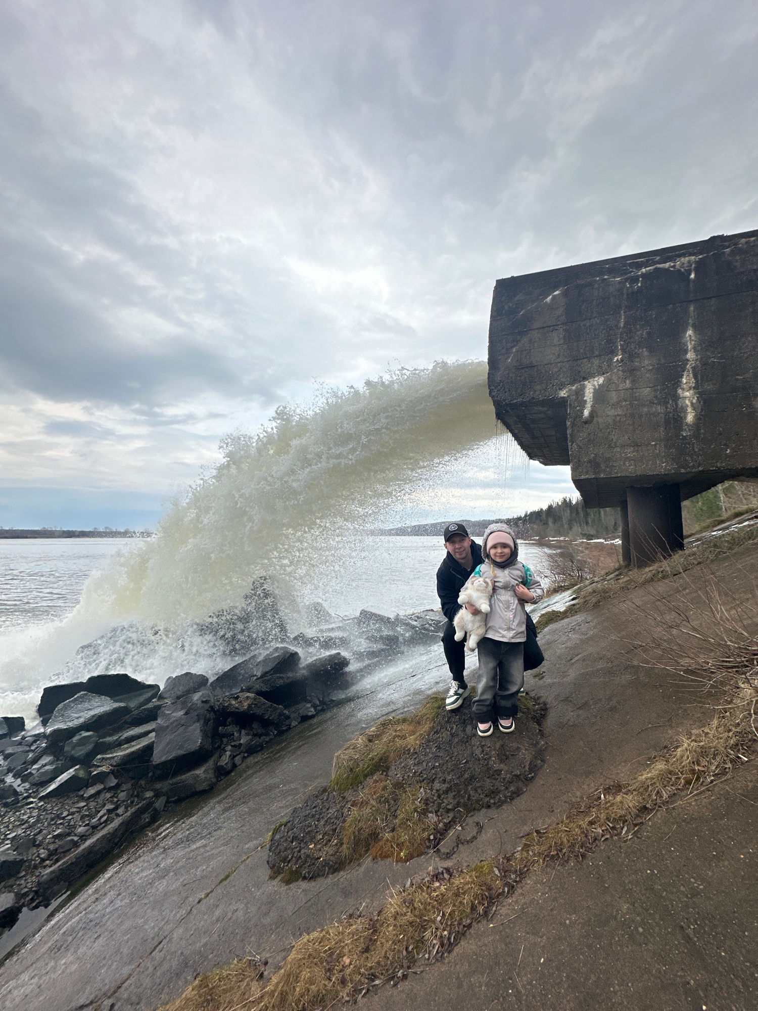 The image captures a concrete structure channeling water into a body of water, possibly a river or lake. A man is holding a child who is carrying a white fluffy animal, likely a dog, near the water ou…read more