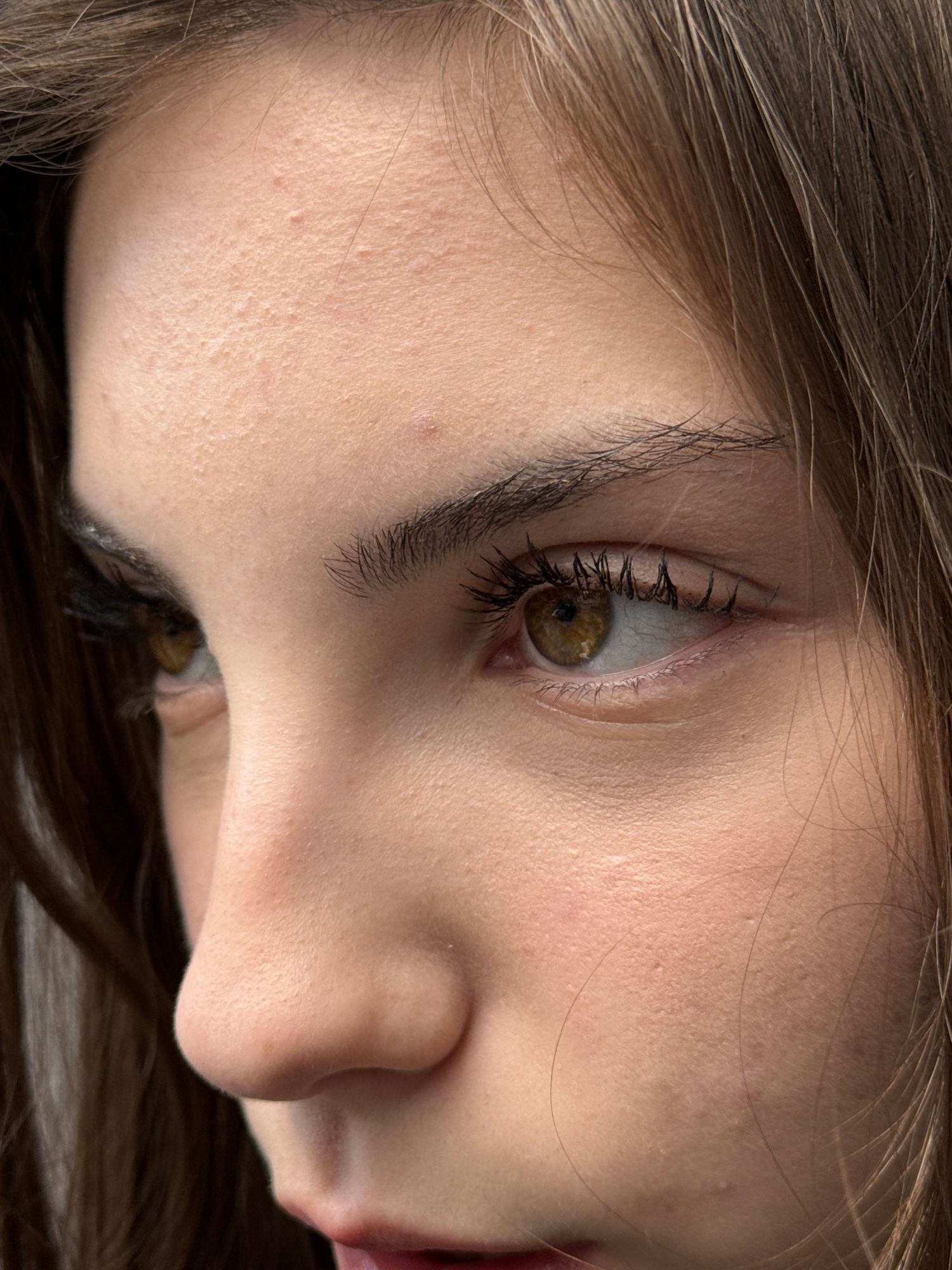 A close-up image shows a person's face in a sideways orientation. The left eye is prominently visible, with brown iris and black eyelashes and eyebrow. The skin appears fair and shows some texture and…read more
