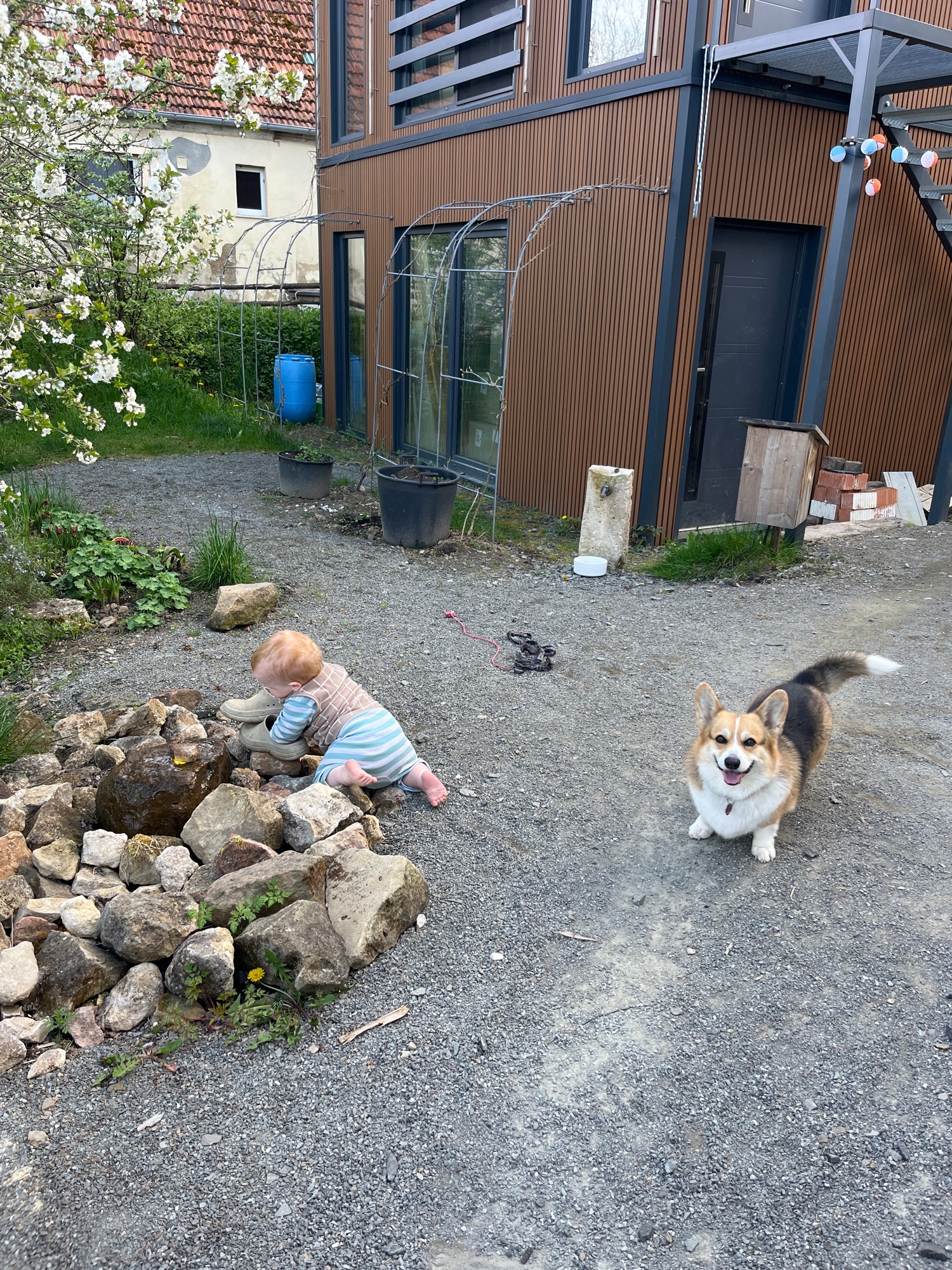 An outdoor scene in Gangloff, Germany, captures a baby and a Corgi dog on a gravel path beside two residential buildings. In the lower right portion of the image, a baby, wearing a light brown plaid…read more