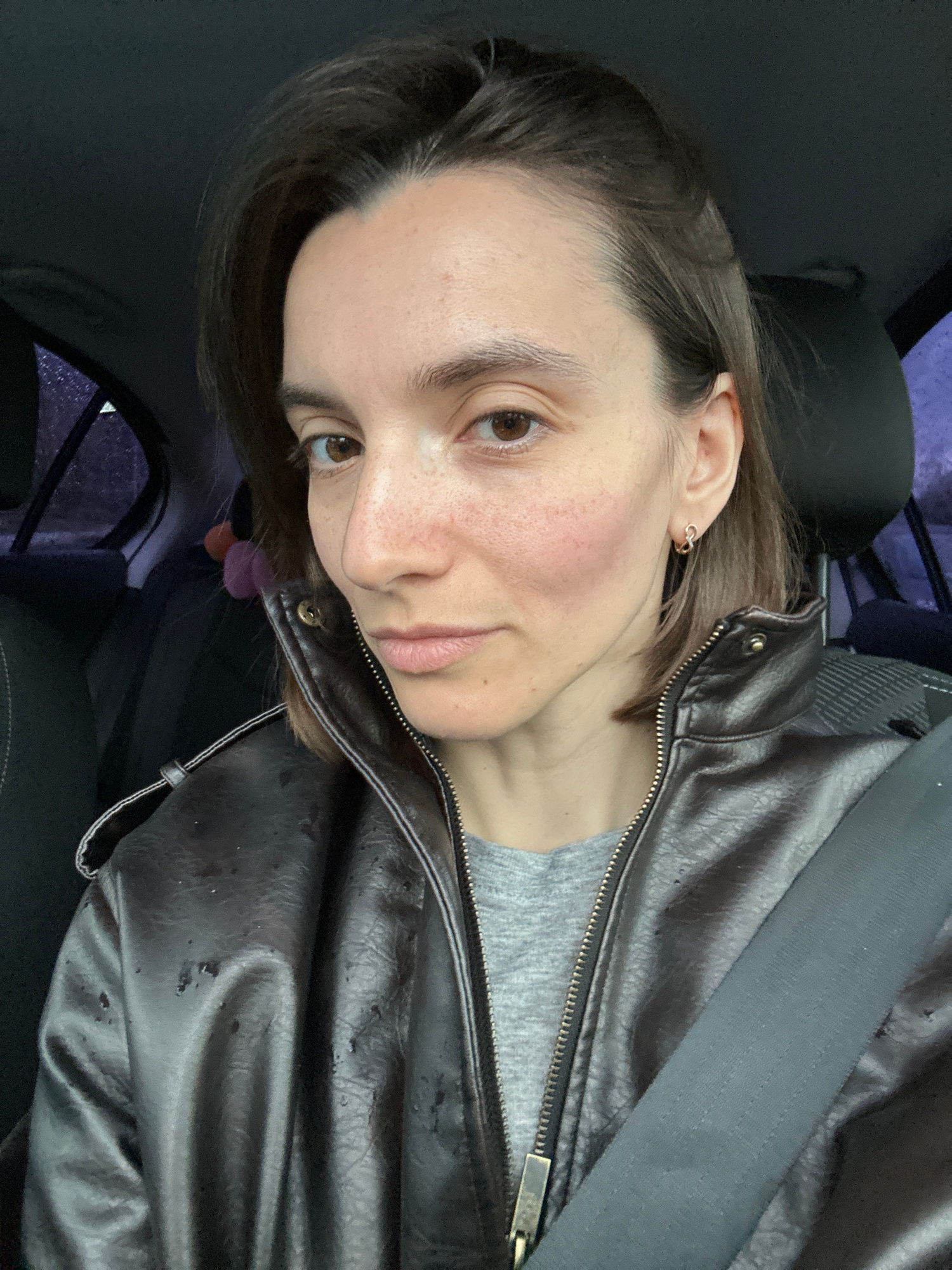 A woman is in a car, wearing a black leather jacket and a grey shirt. She is wearing a seatbelt. The background suggests an urban environment. It is not possible to verify the location as Moscow, Russ…read more