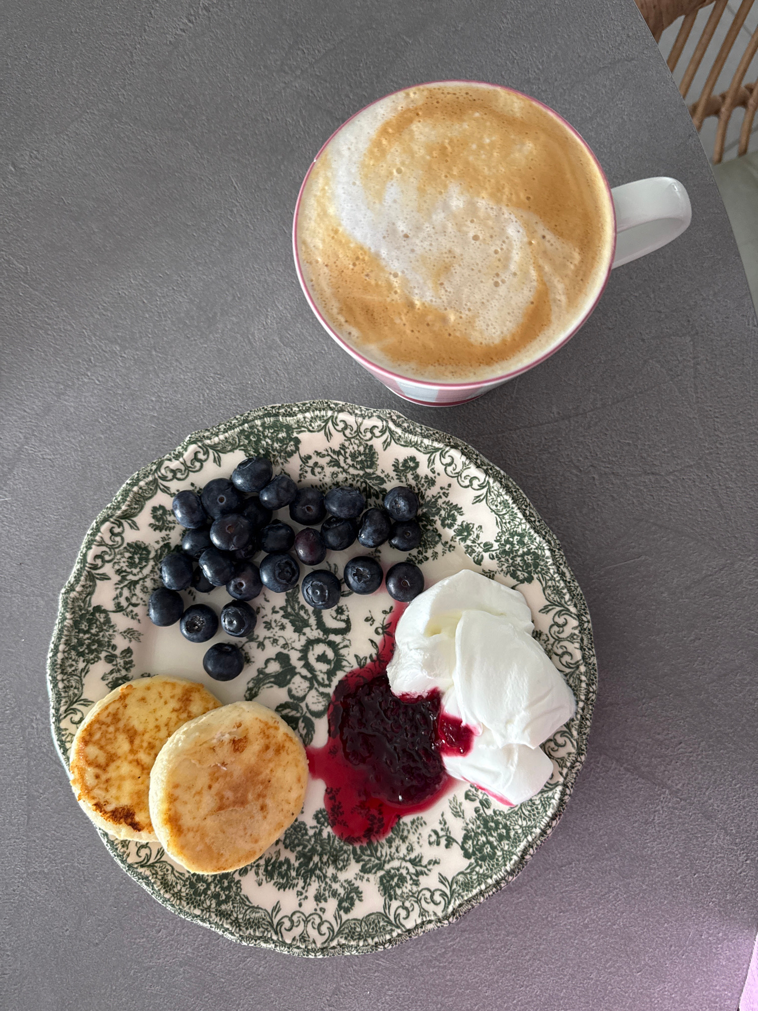 A high-angle shot displays a breakfast scene on a gray surface, likely a table. To the left, a mug filled with a foamy latte rests. Adjacent to the mug is a patterned plate containing a portion of blu…read more