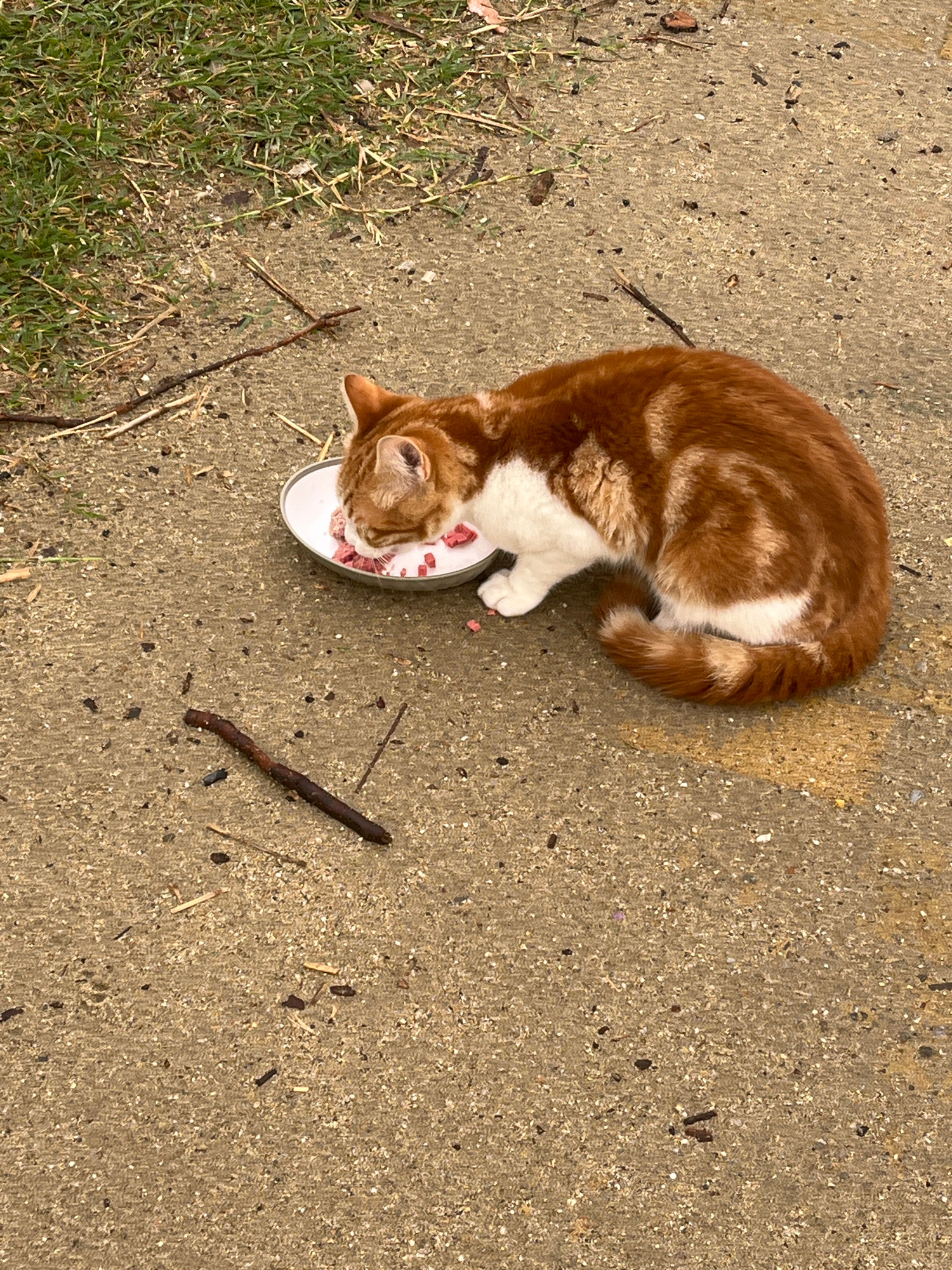 An orange and white cat is eating from a silver bowl on a concrete surface. The cat is curled around the bowl, focusing on its food. Scattered around the bowl and on the concrete are small twigs and p…read more