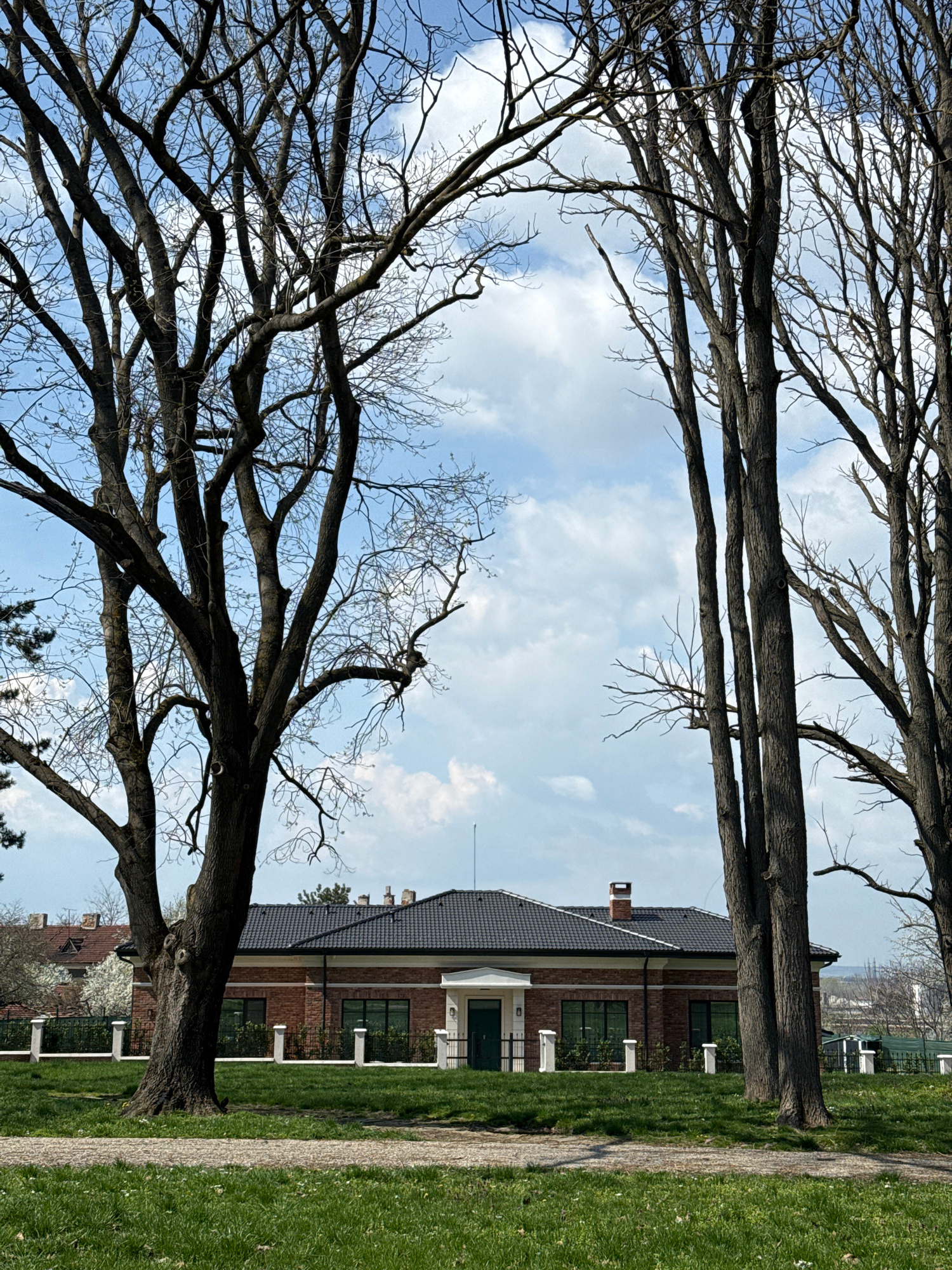 The image is taken outdoors in Ruse, Bulgaria, likely during late winter or early spring. A brick building with a dark roof, green door, and matching window frames is visible behind tall bare trees. T…read more