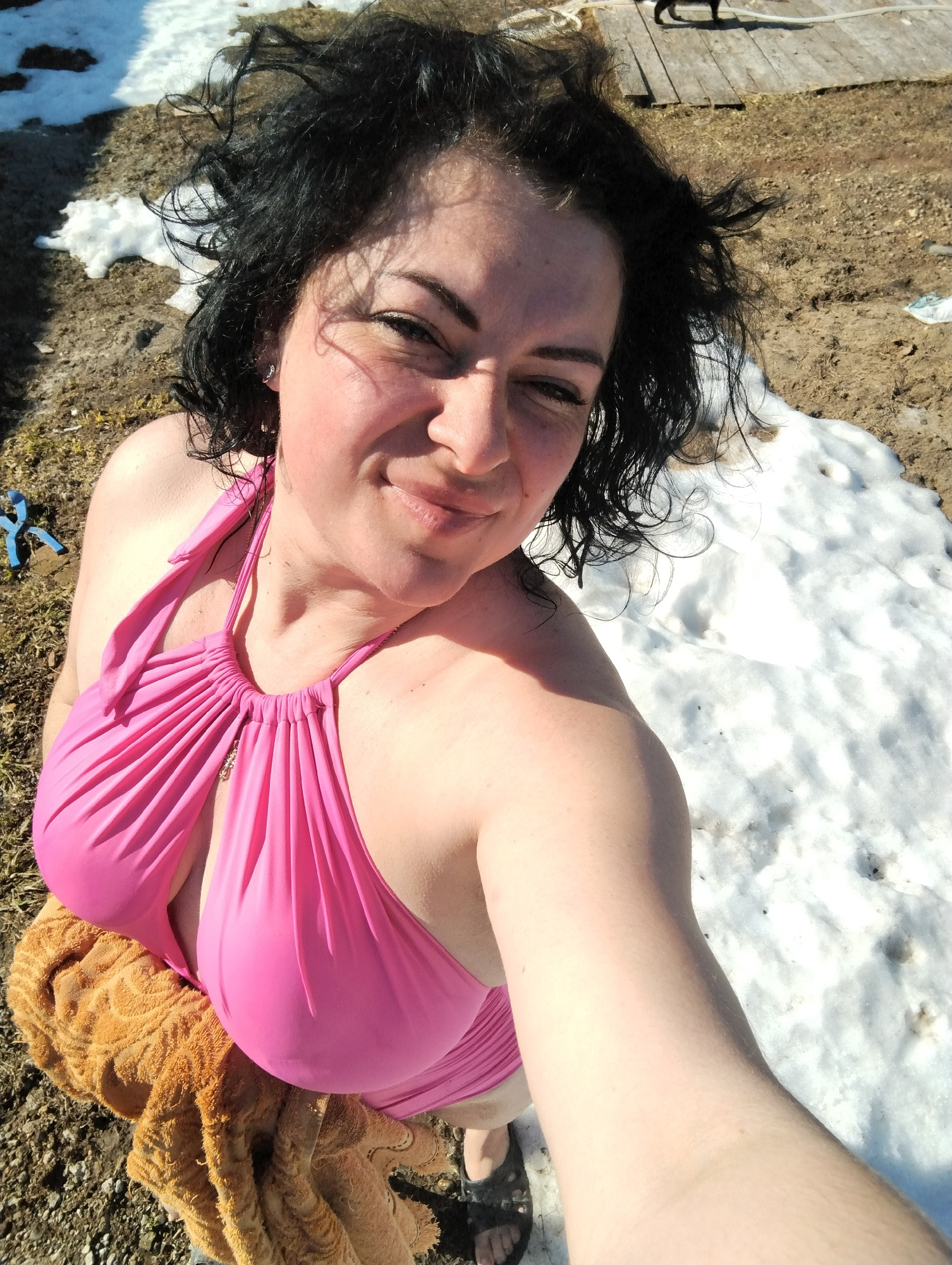A woman with dark, wet curly hair poses in a pink swimsuit against a backdrop of melting snow and mud. She is holding the camera at arm's length, taking a selfie. A brown towel is draped over her. Patβ¦read more