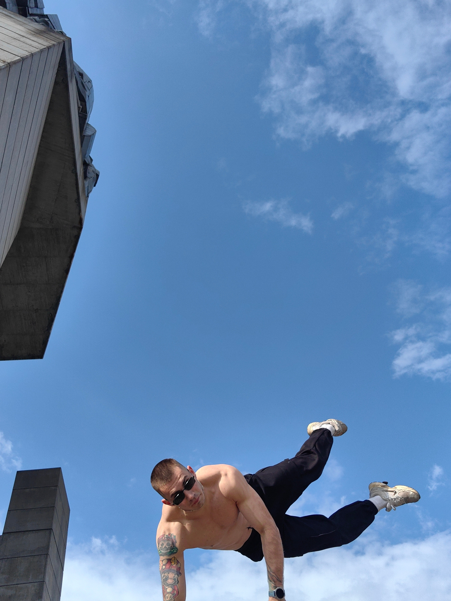 A low-angle, medium shot captures a shirtless man with short hair and sunglasses, performing a handstand in front of a clear blue sky with scattered clouds. He wears black track pants and white sneake…read more