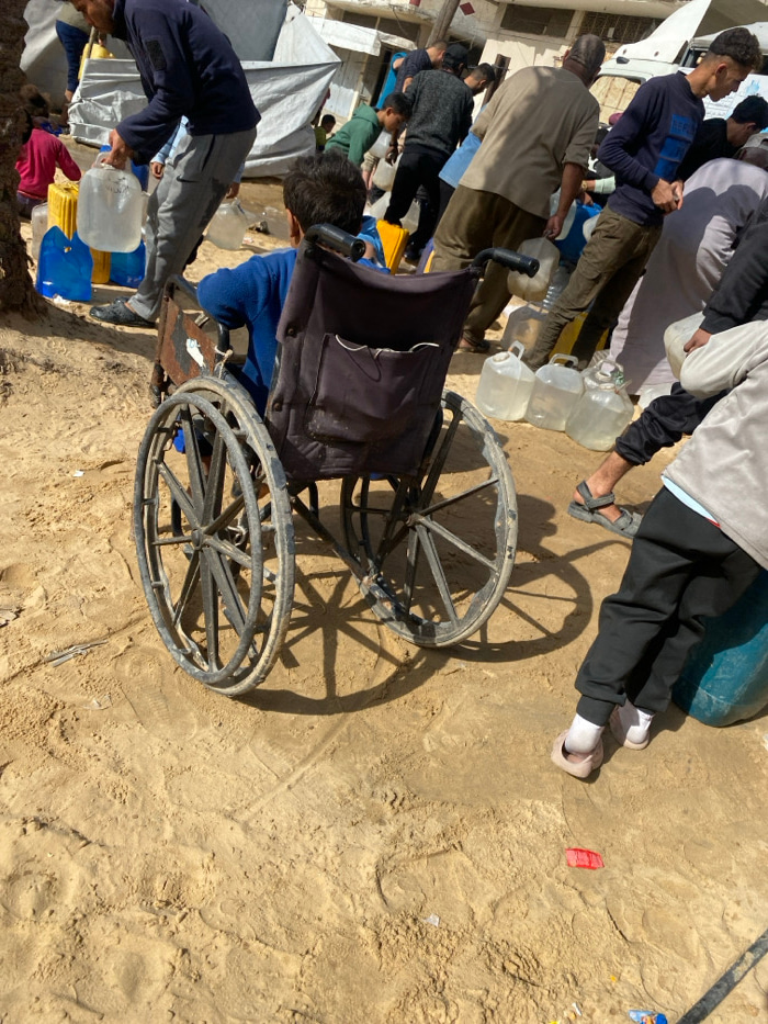 The image depicts an outdoor scene in Deir el-Balah, Palestinian Territory, characterized by a gathering of individuals and numerous water containers on sandy ground under direct sunlight. In the for…read more