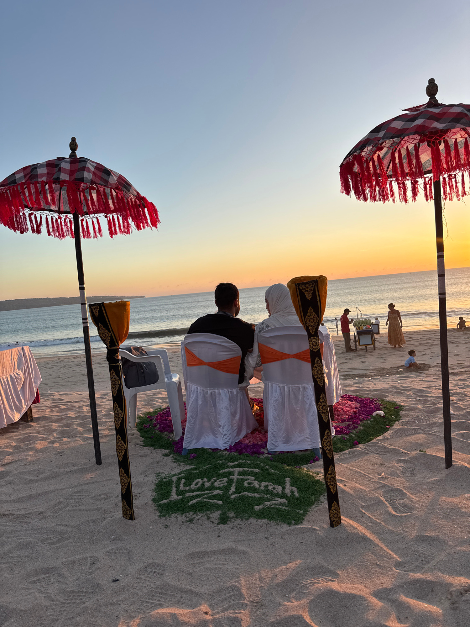 The image depicts a serene beach ceremony in Kuta, Indonesia, at either sunrise or sunset, characterized by the warm orange and yellow glow on the horizon and the clear, light blue sky above. The sand…read more