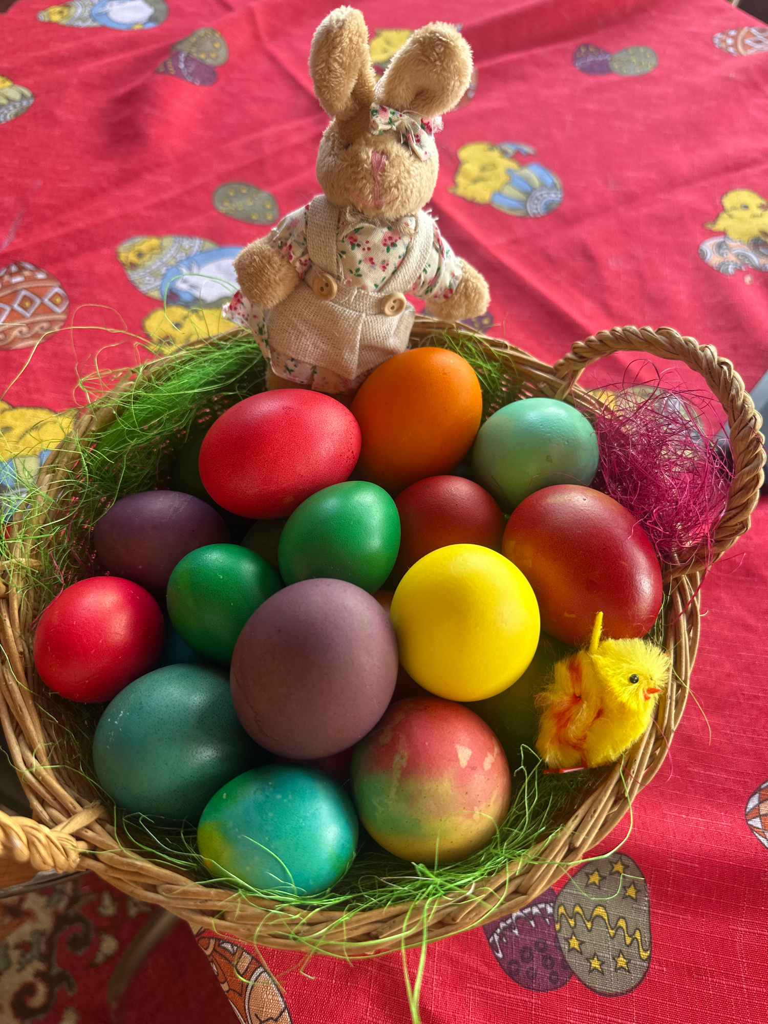 A high-angle shot captures a woven basket overflowing with vibrantly colored Easter eggs. The eggs, a variety of hues including red, orange, yellow, green, purple, and teal, nestle within a bed of art…read more